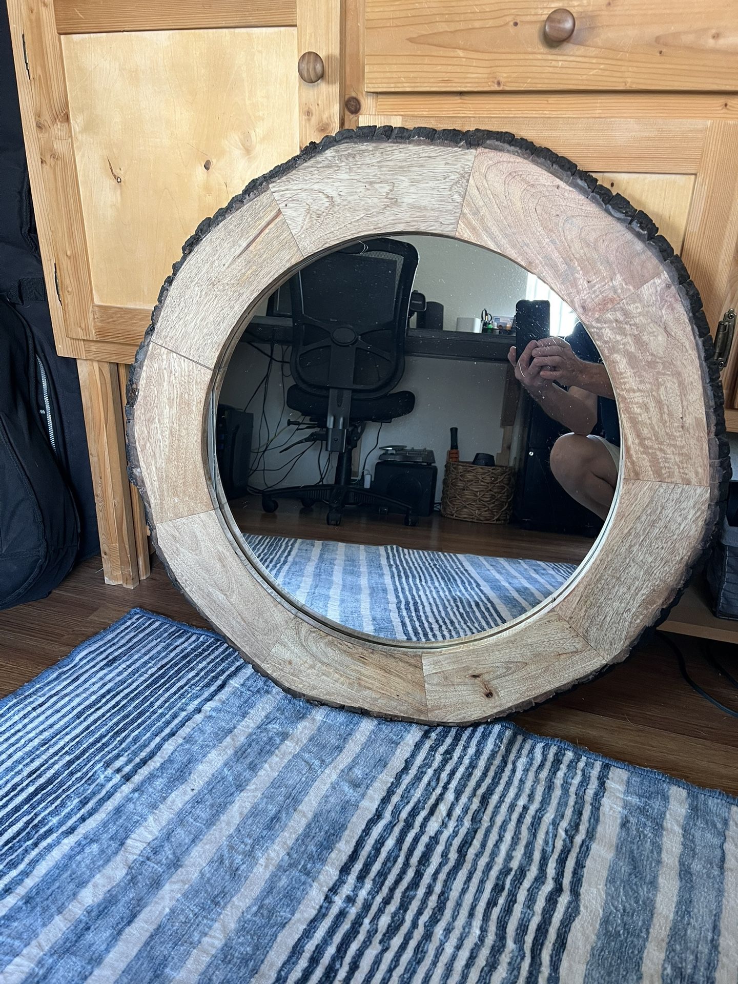 Live edge round Acacia wood mirror 29” inches across ready to hang on your wall