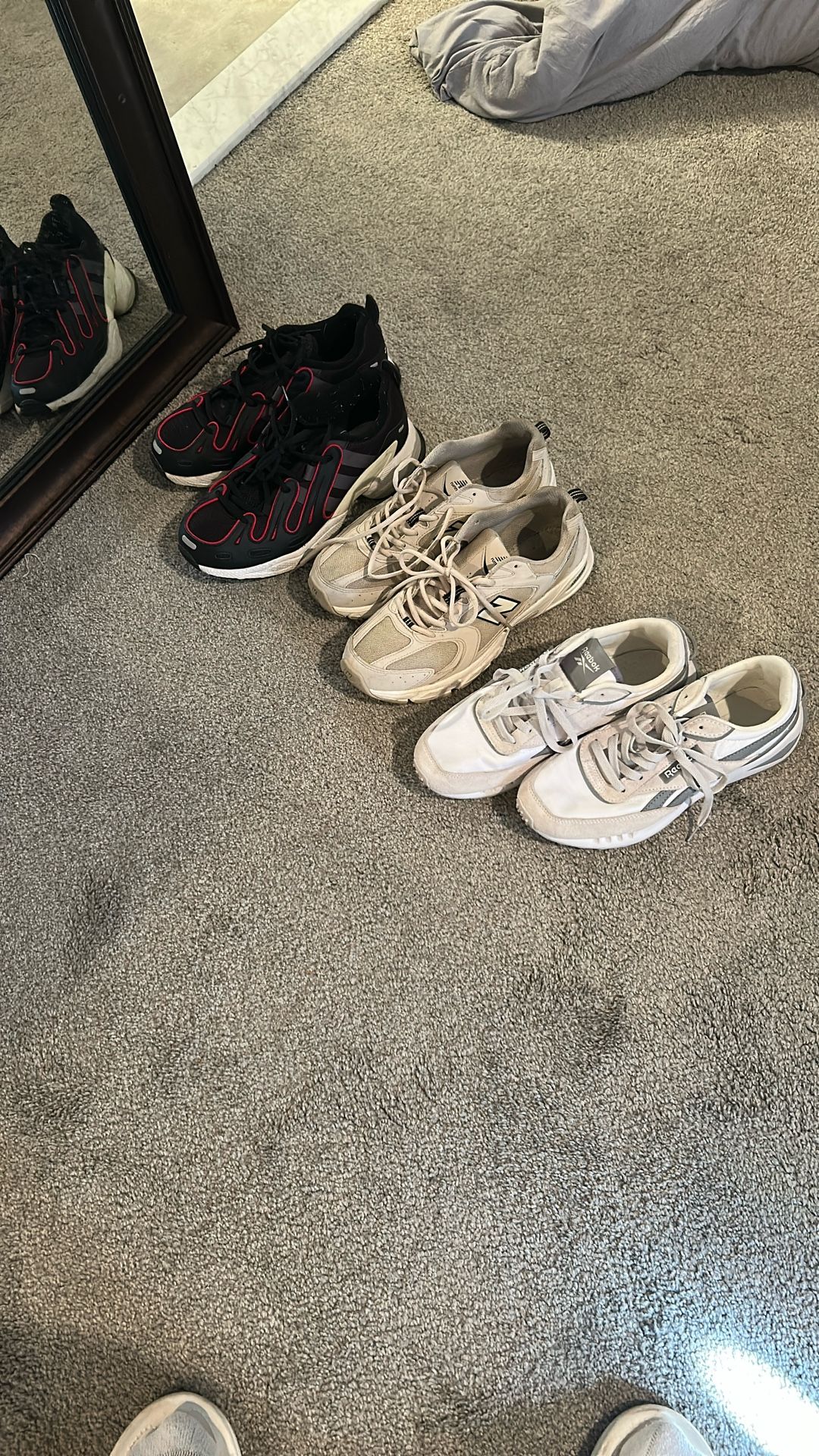 Adidas , Reebok ,NB Fair use ,insoles missing my brother always wanted to try to fit my sneakers . Family matters lol Reebok women nine Adidas men nine New balance men’s nine 25$ each