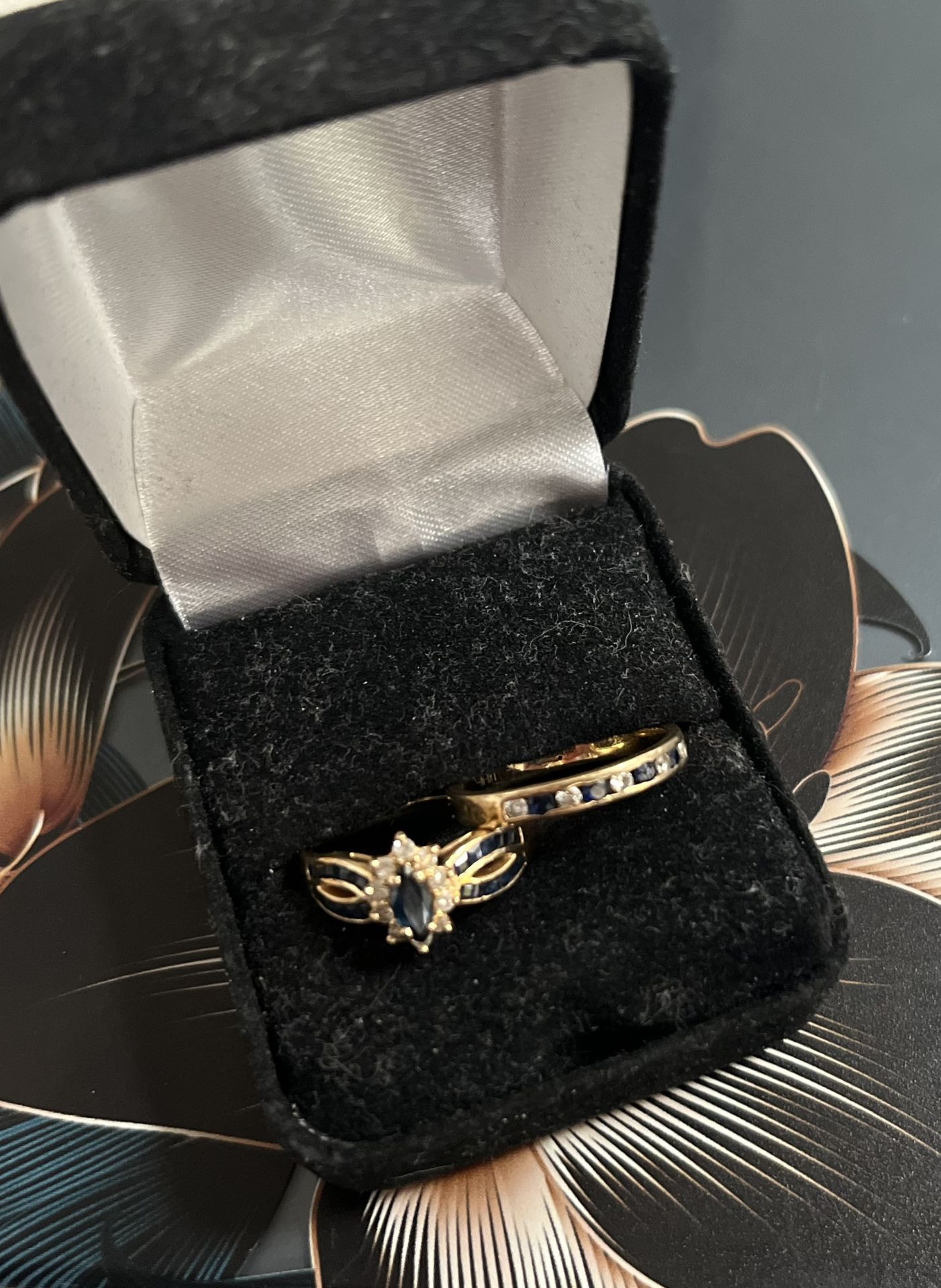 Sapphire stone surrounded by diamonds. 14 karat gold. Size 6.