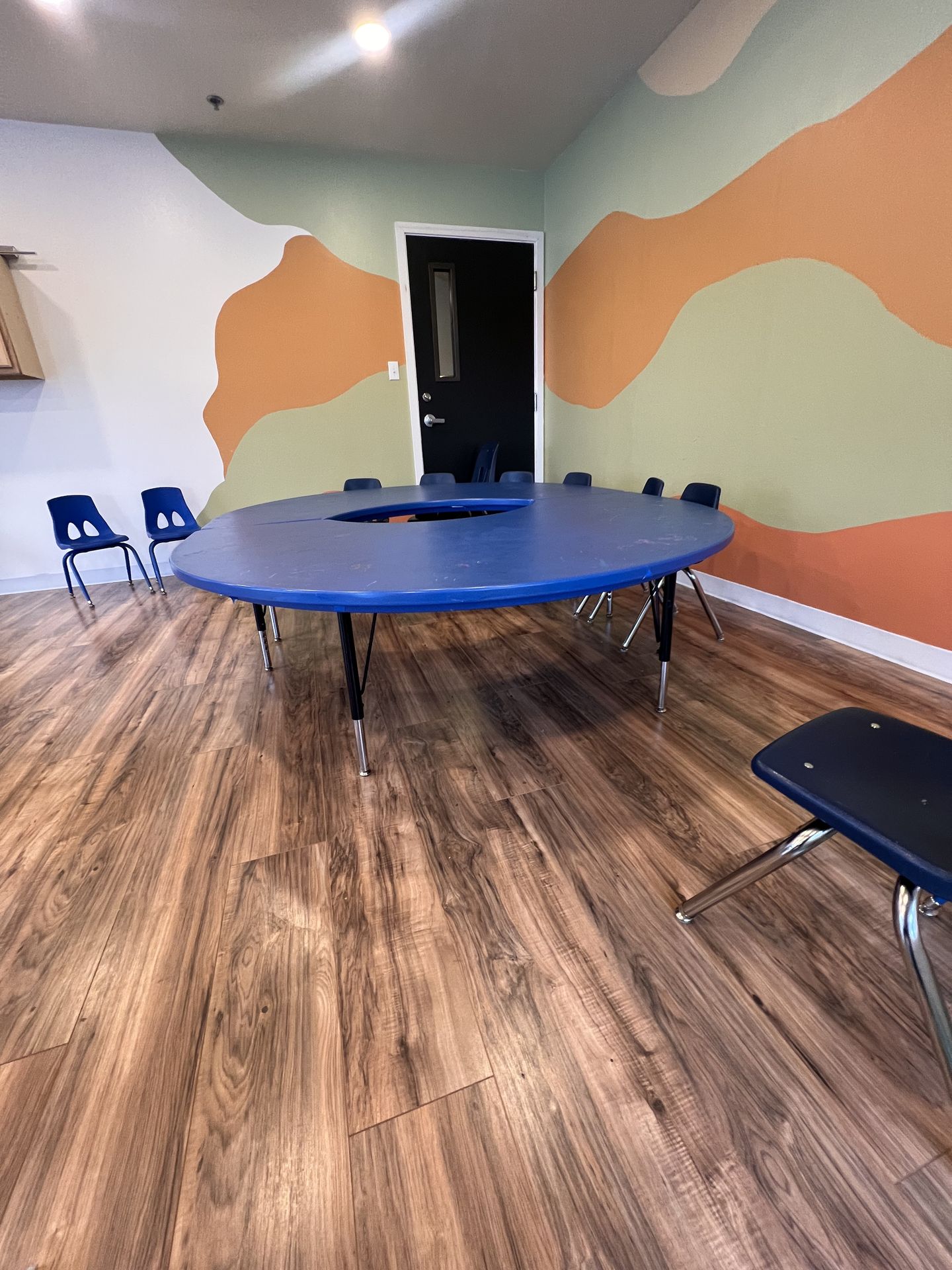 2 Half moon Kids tables. **Perfect for a classroom. Used & could use a good clean. Great for ages 4+. Seats 6 kid size chairs outer moon & 3 on the inner moon. Take both or take 1. Each table for $100 or $220 for both.