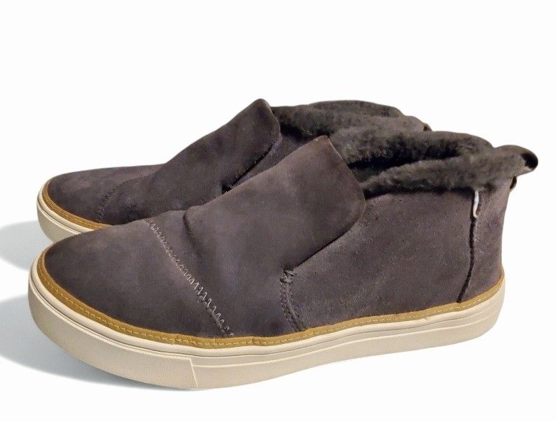 Stylish and comfortable women's slip-on shoes in a versatile gray color. Perfect for casual outings. TOMS Women's Paxton Suede Boots. They are a popular style of ankle boot designed to combine the sturdiness of a boot with the comfort of a sneaker. Brand: TOMS Style Name: Paxton Material: Suede upper with inner lining faux fur. Color: Forged Iron ( grey). Design: These are a mid-cut, slip-on style booties featuring a thick white 1" rubber outsole and a contrasting band along the sole edge. Features: Hybrid insole for cushioning. Shoes are in great condition. Women's Size 10 Stock # WG12