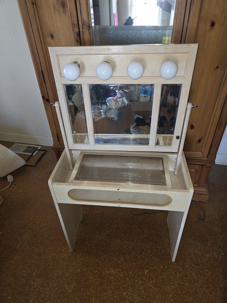 A nice makeup vanity with Hollywood-style lighting and a pocket cubby for storage. The mirror flips and can tilt as needed. We also do not know if the bulbs are still good. Dimensions: 31" x 13-3/4" x 54-1/2"