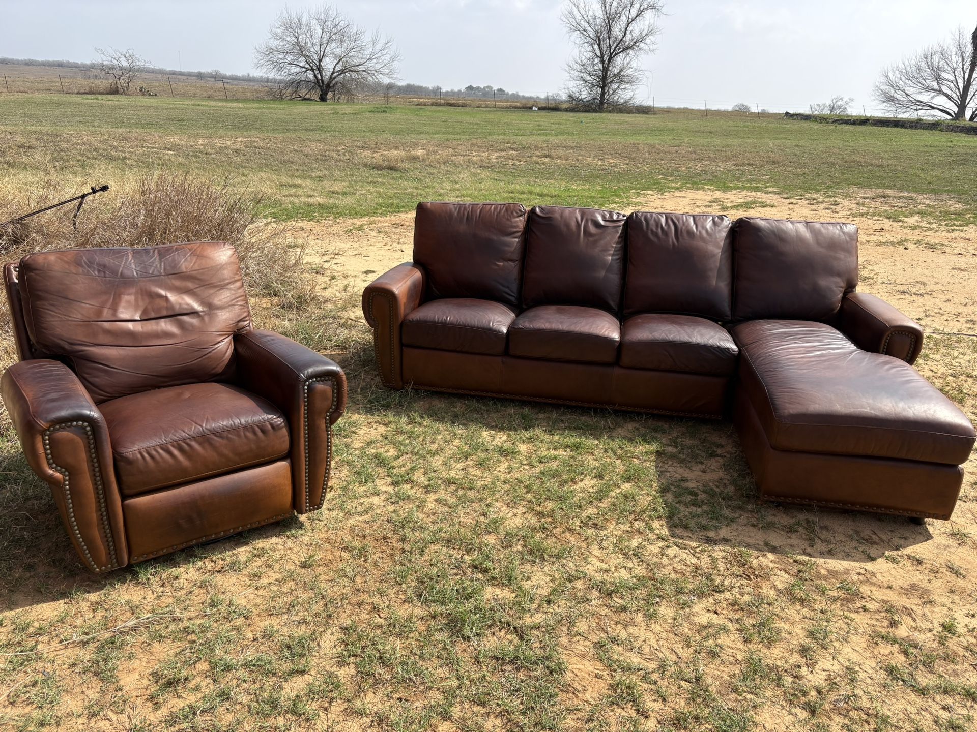 Omnia Leather Custom Genuine Leather Living Room Set – Like New – $1800 OBO This is a practically brand new, custom Omnia Leather genuine leather living room set in excellent condition. No scratches, cuts, tears, or holes — it has been extremely well cared for. Details: Custom genuine leather sectional by Omnia Leather The sectional alone was originally quoted at approximately $10,000 (without the chair and without the reclining feature) Hidden reclining feature built into the sectional — reclines back comfortably Matching leather rocking & reclining chair originally quoted at approximately $4,000 Very clean and well maintained Pet history, but no hair and no damage Total value is approximately $15,000 for the full set. This is high-end, handcrafted leather furniture offered at a fraction of retail. Measurements: Chair: Width- 38 inches Height- 34.5 inches Depth- 39 inches Sectional part: Depth: 73 inches Width: 30 inches Whole couch: Length: 102 inches Width: 38.5 Asking $2,500 OBO Send an offer — the worst I can say is no! (Just brought outside to take pictures)