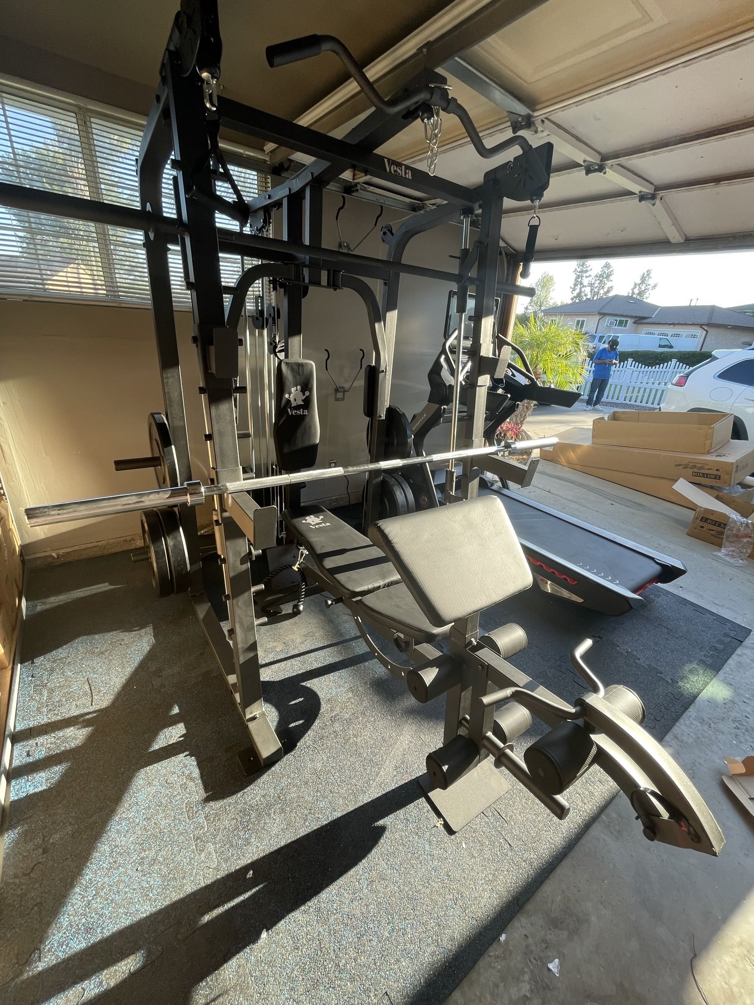 New In Box! FREE DELIVERY AT FULL PRICE!Click Profile For More Gym Listings! Only Account! Cash / Venmo / Credit Cards / Finance Available! WARRANTY INCLUDED The Vesta Multi-function Smith Machine SM2001 is equipped with different strength machines and exercise station to bring the full gym experience to your home gym. It is designed to have a variety of exercises within one compact design The Ultimate ALL-IN-ONE Machine: Smith Machine Squat Rack Functional Trainer Lat Pulldown Weight Bar Preacher Curl/Leg Lever Bench Press Butterfly Arm Dimension for SM2001 Machine: 84“H x 74“L x 83"W Dimension for FID Bench: 36"H x 73"L x 19"H Upgrades or Add Ons •Free Switch to 245lbs Cast Iron plates 45s/35s/25s/10s/5s/2.5s •$40 3ft by 3ft Rubber Mats •$90 4ft 20lbs Curl OLYMPIC WEIGHTS GYM EQUIPMENT OLYMPIC STANDARD WEIGHT SLED PUSH SLED WEIGHTS WEIGHT PESAS SQUAT RACK POWER CAGE SMITH MACHINE BENCH PRESS INCLINE DECLINE BARBELL BAR HEX BAR BUMPER PLATES ADJUSTABLE BENCH FLAT BENCH BENCH DUMBBELLS DUMBELL ADJUSTABLE DUMBBELLS KETTLE BELLS DIP STATION PULL UPS PULL DOWN BATTLE ROPE BOWFLEX POWERTEC POWERBLOCKS HOIST BODY SOLID ROGUE FITNESS EXERCISE