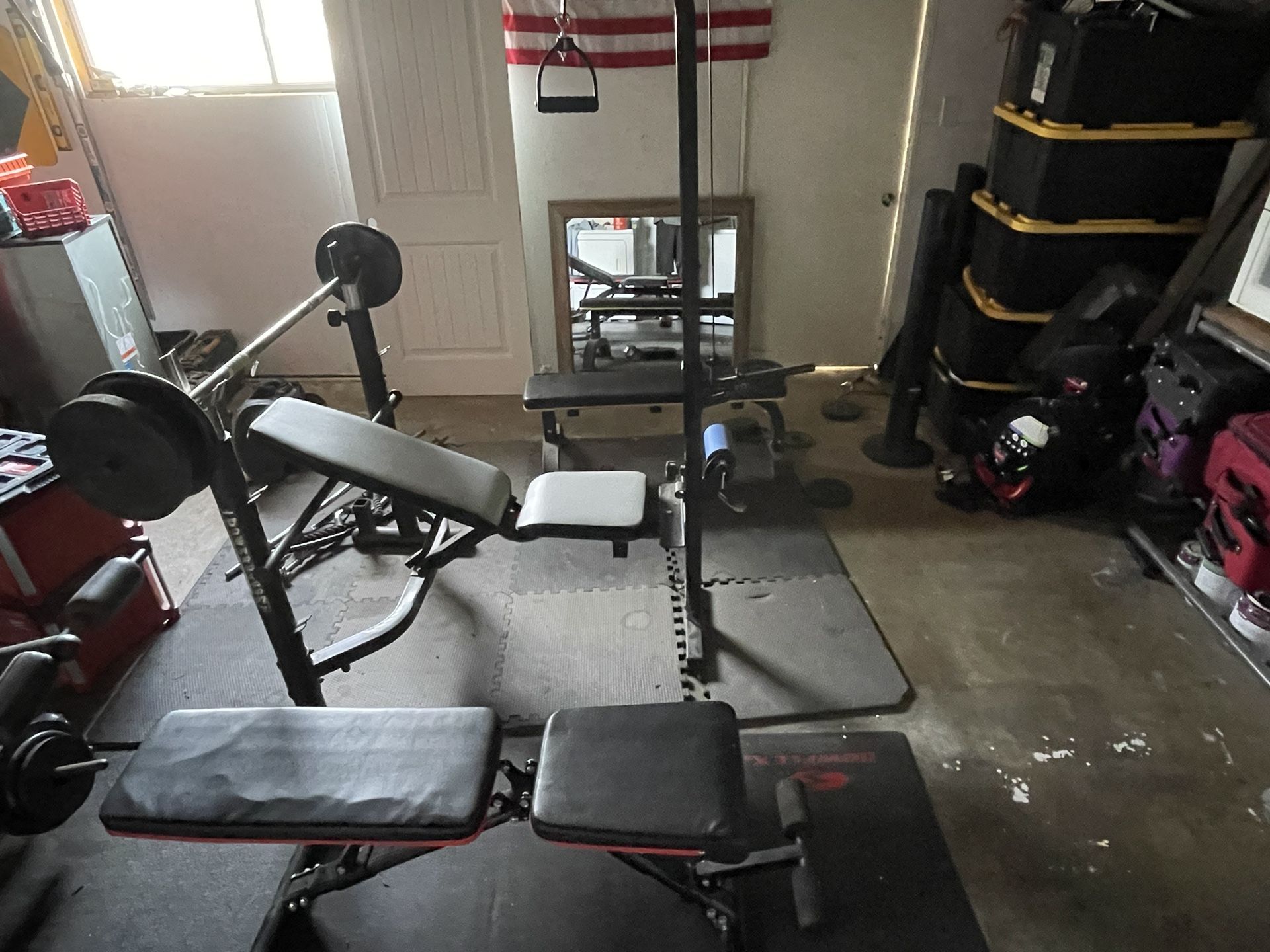 3 benches and flooring and a few weights