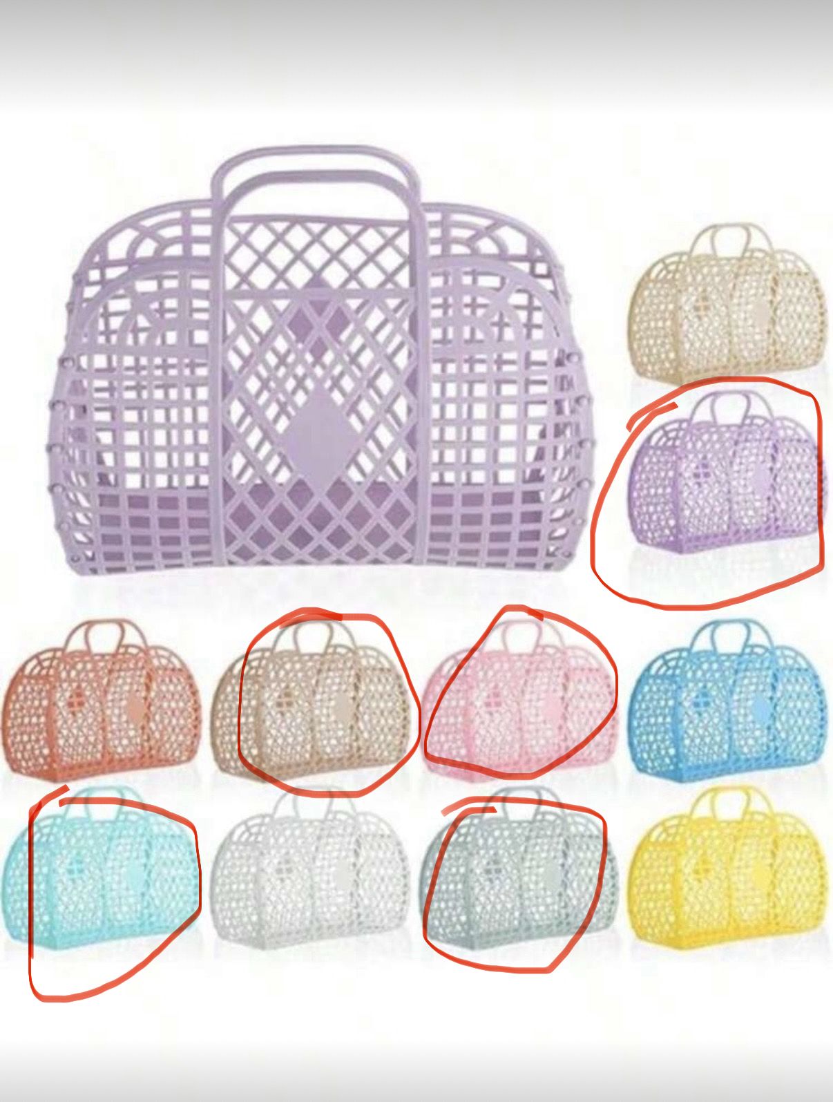 Womens or Girls plastic tote‼️ Considered Small tote I circled the colors I have available ✨2 shades of Pink ✨Blue ✨Purple ✨Sage Green