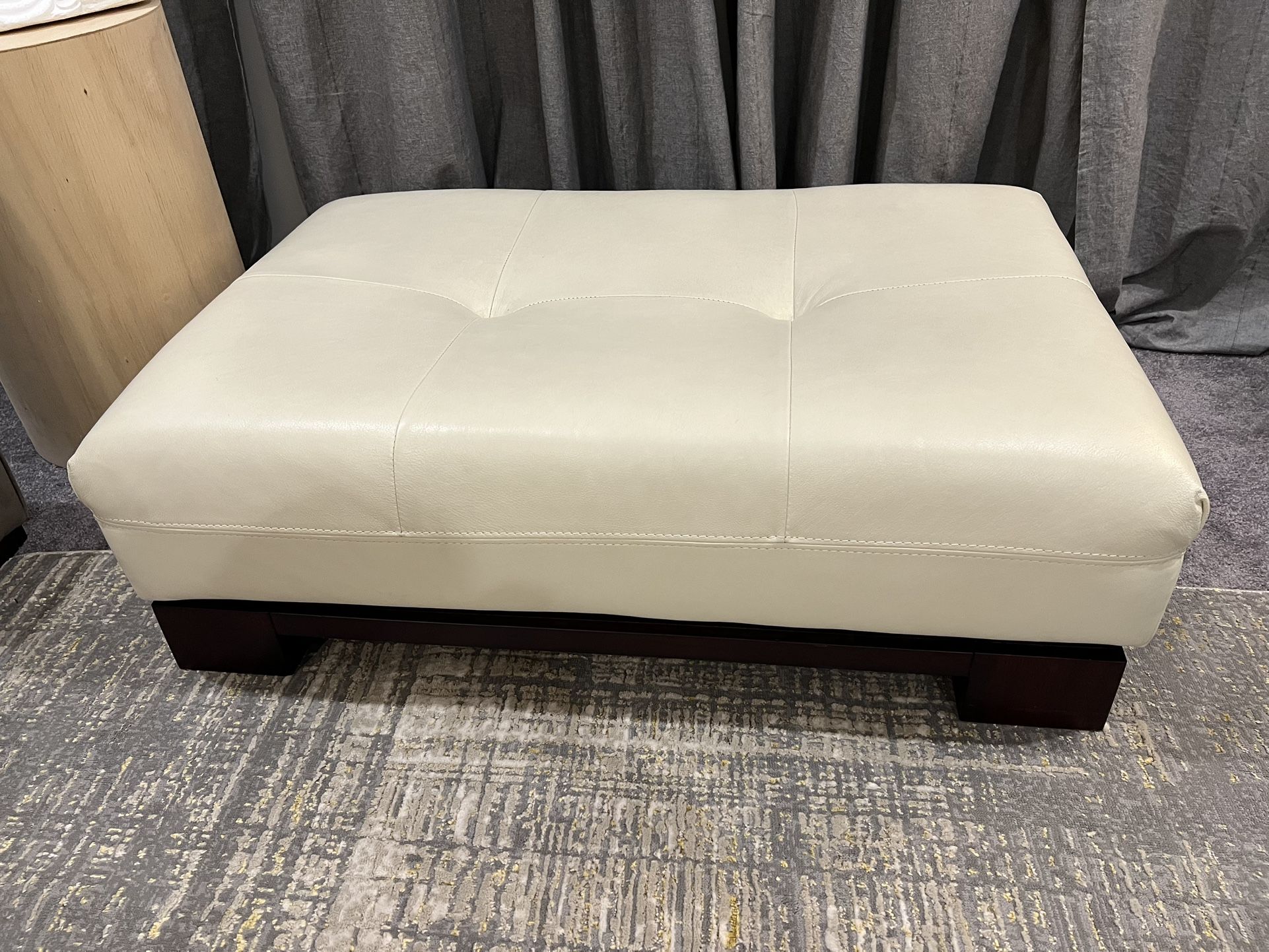 -Minimalist design -Neutral color -Genuine Italian leather -Excellent condition -Solid wood frame base with step off detail -Broad, wood legs -Sturdy and comfortable -Modern, yet timeless -41 x 27 x 13 -Multifunctional: as a sofa extension to make it “L-shaped”, as a foot rest, a seat, or a coffee table with a tray on top -Perfect for a living room, family room, loft, bedroom, or office -Smoke-free, pet-free home -FCFS