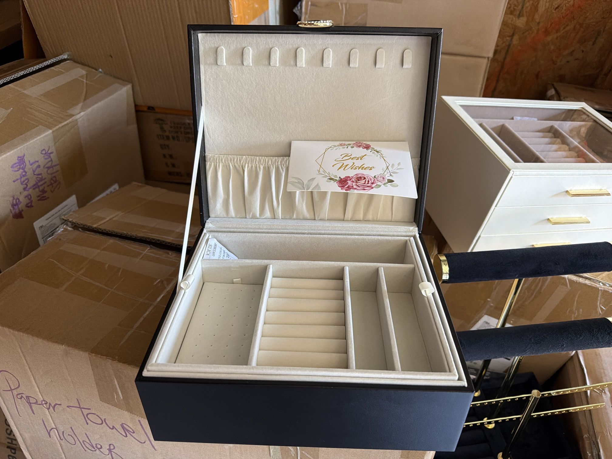 brand new! in black white and beige, boxes, ring holders,necklace stands, bracelet and earring holder,trinket trays, perfect for elegant touches to your bedroom!<3