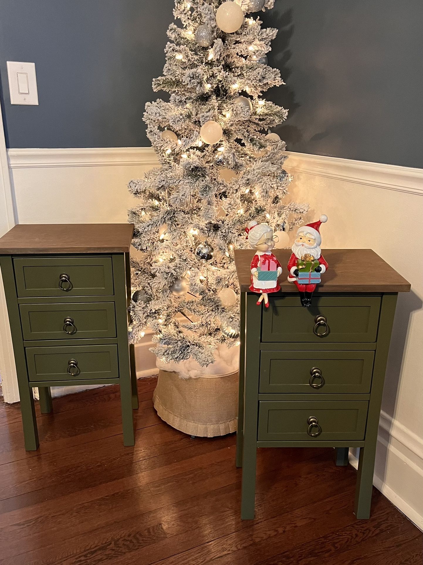 Country nightstand set These slim 3 drawer night stand set were refinished in durable Behr “Mountain Olive green” satin enamel with stained satin finish wood tops and Antique brass hardware for the perfect accent to add a pop of color to any bedroom. Each night stand measures: 16”w x 12”d x 29”h $200 picked up (local delivery w/charge) Will only hold with deposit CASH only, no zelle DM to purchase.