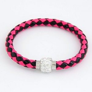 Rhinestone Embedded Silver Tone Bead Decorated Rope Weaving Bracelet/Rose