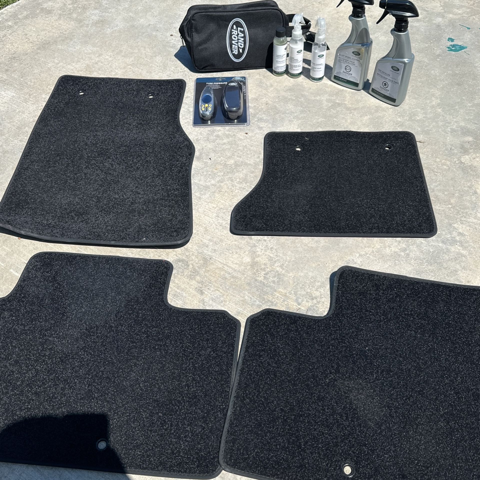 Unused floor mats. Land Rover tote bag with cleaning kit and tire gauge.