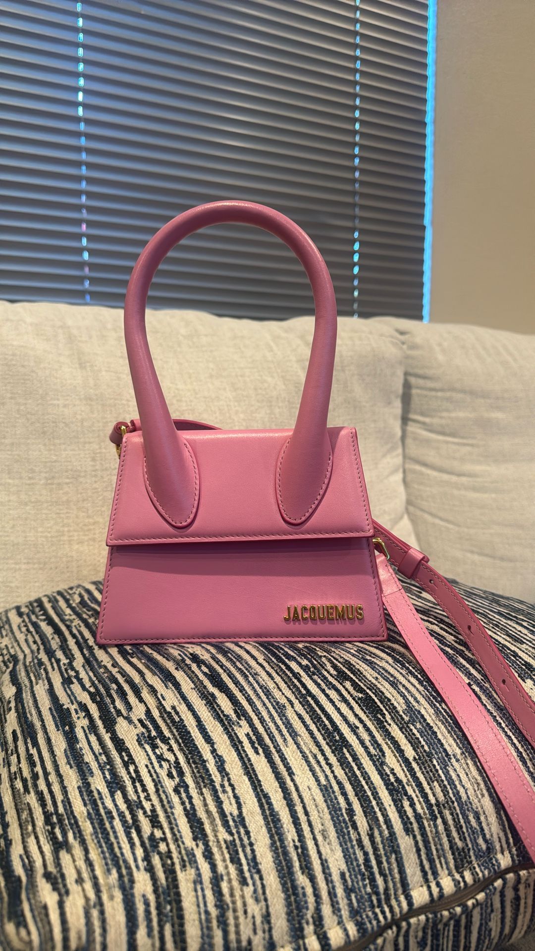 Jacquemus Top Handle Bag Pink Leather Gold-Tone Hardware Rolled Handle & Single Adjustable Shoulder Strap Canvas Lining & Single Interior Pocket Flap Closure at Front