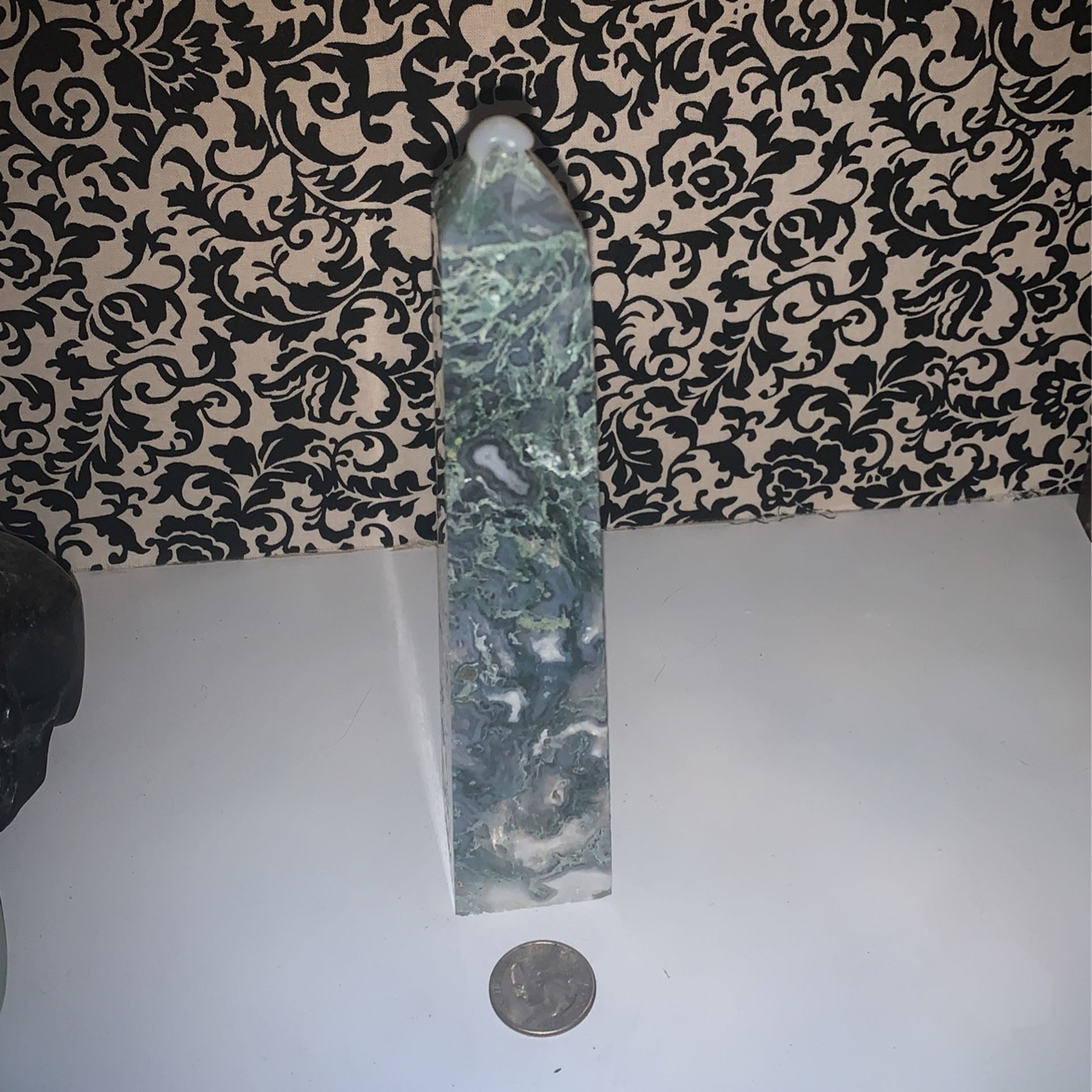 moss agate tower. Green and white with clear inclusions and natural Quartz druzy. Beautiful piece