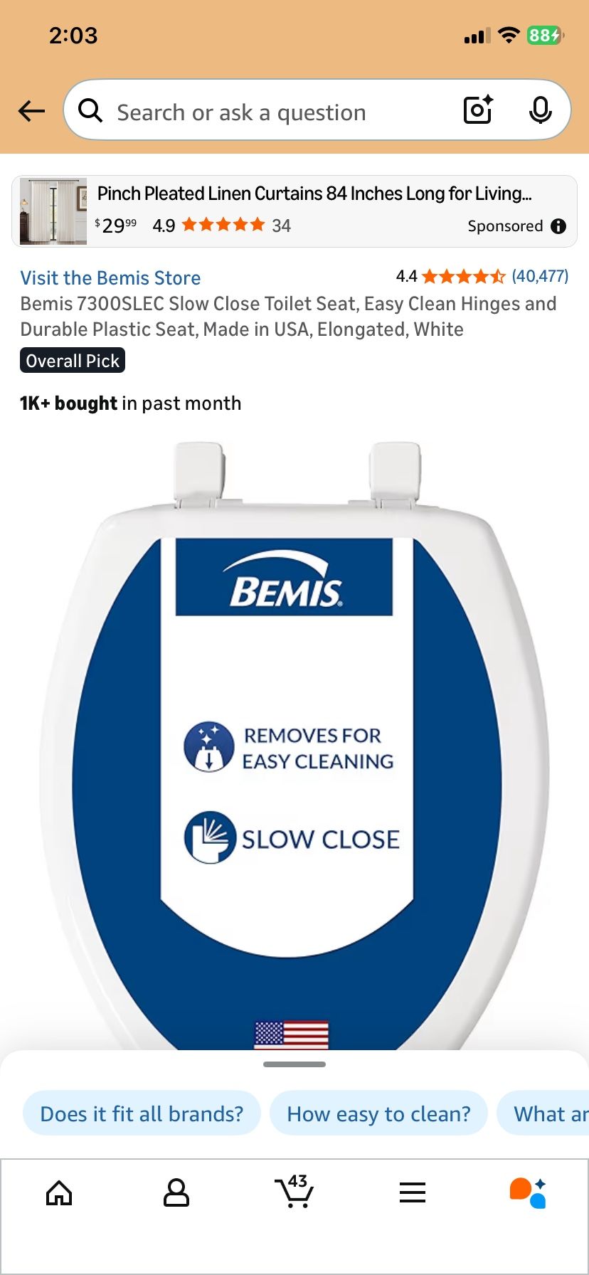 Bemis 7300SLEC slow close toilet seat. Easy clean hinges & durable. I purchased it without measuring & it’s too big. It has never touched my own toilet. Amazon’s price is $30.48. My loss is your gain.