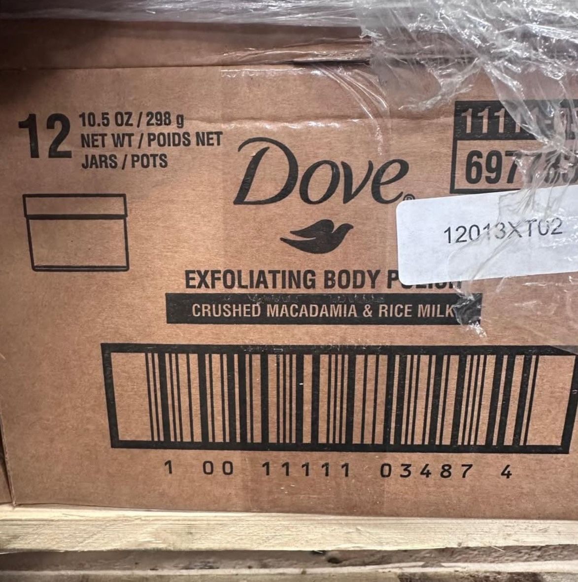 All products new & sealed We have a couple pallets of exfoliating Dove Body scrub 10oz 12pk/case Scent- Macadamia & Rice Milk Message for more info!