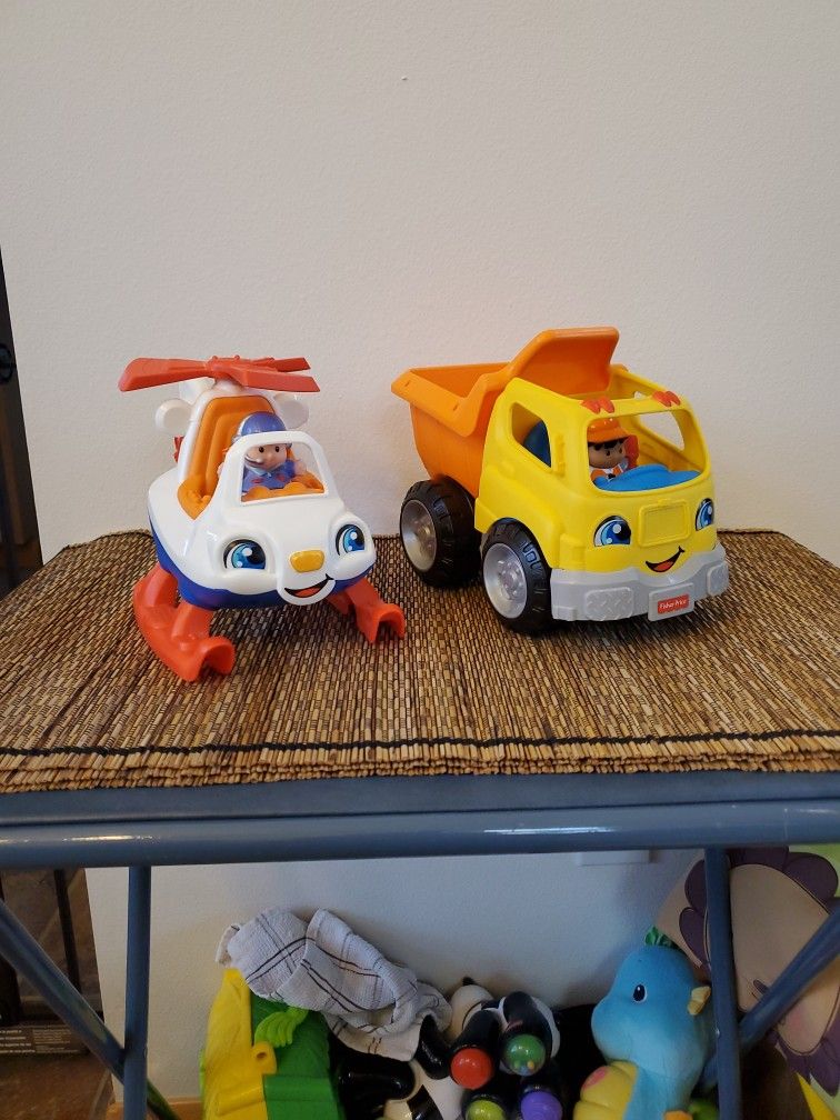 GREAT Lot! Both Helicopter & Dump Truck in "EXCELLENT" Condition! Battery Compartments as well. The Little People Figures and Boulder are not original but work great with each toy. These have only been played with indoors. Clean. Sanitized, new batteries. Would be great to add to Easter Baskets! Please view all pictures thoroughly as they are a oart of the description. Thank you!