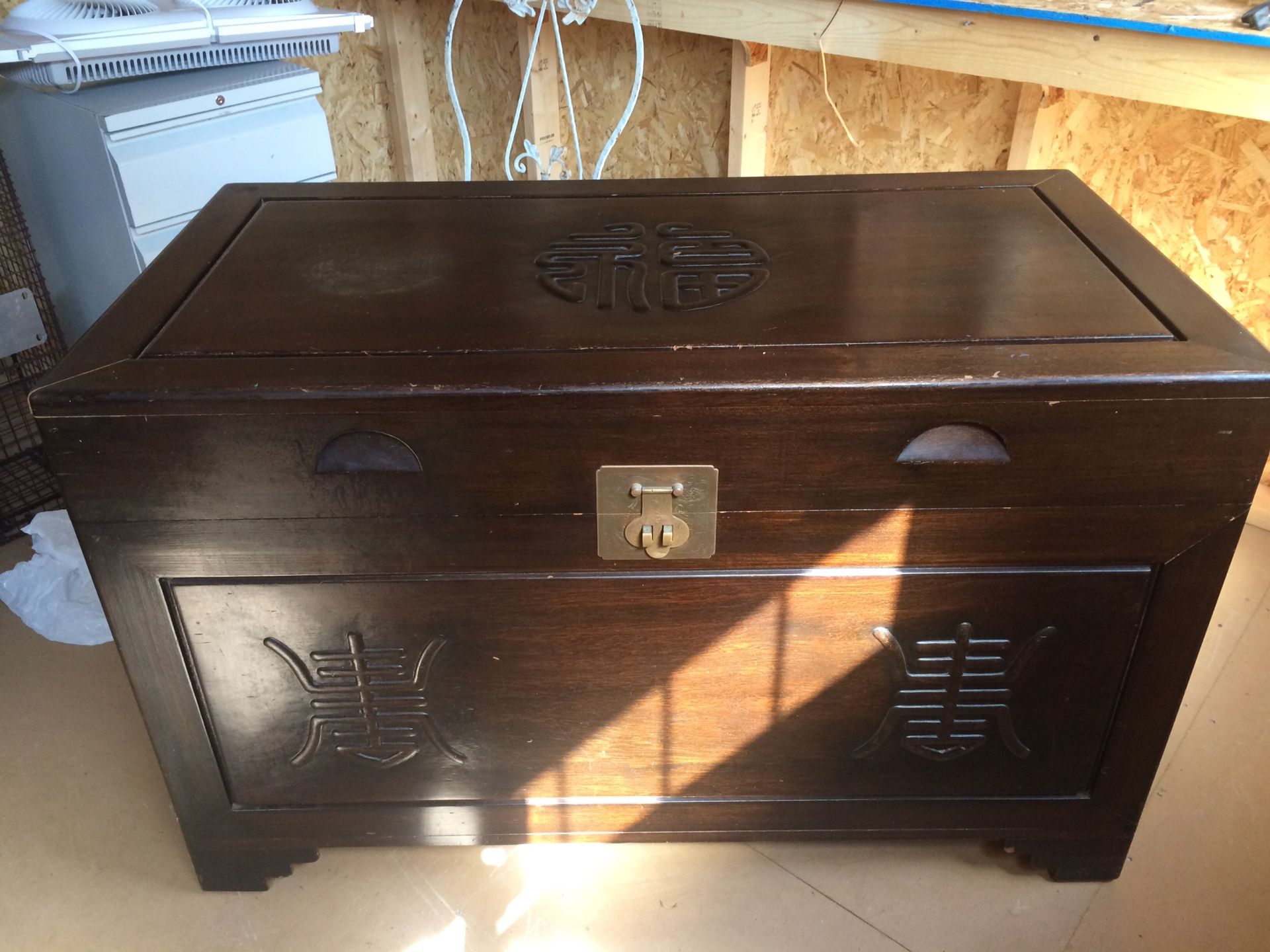 Heavy antique teak chest with original brass latch and closure. Stunning interior Top can use some tlc Location Oceanside