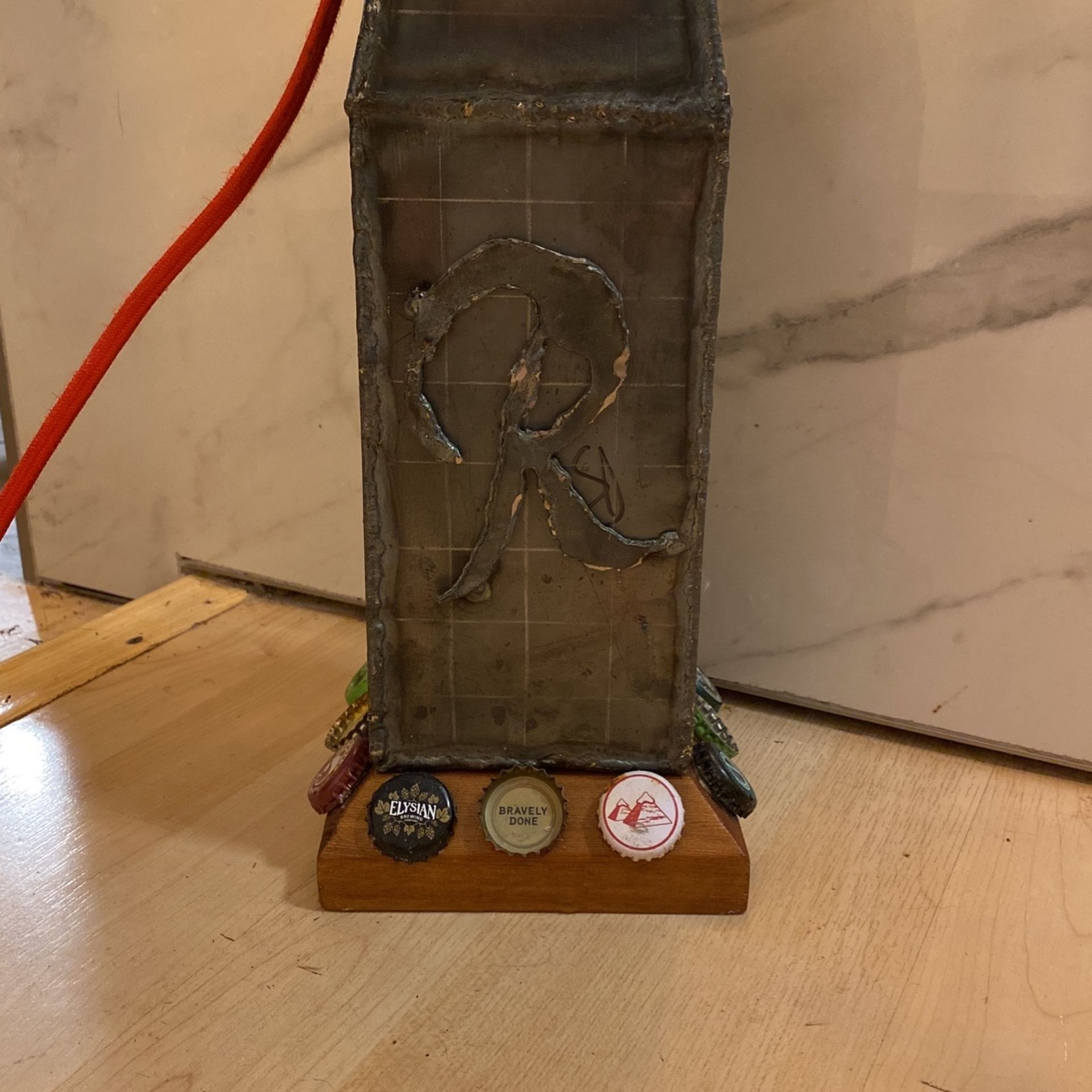 Table top lamp /light. Hand made, one of a kind up-cycled welded steel /metal base with varnished wood, decorative bottle caps, cage light frame and Edison bulb (new). Beautiful gold lamp /sash with red cord (new). R for Rainier.