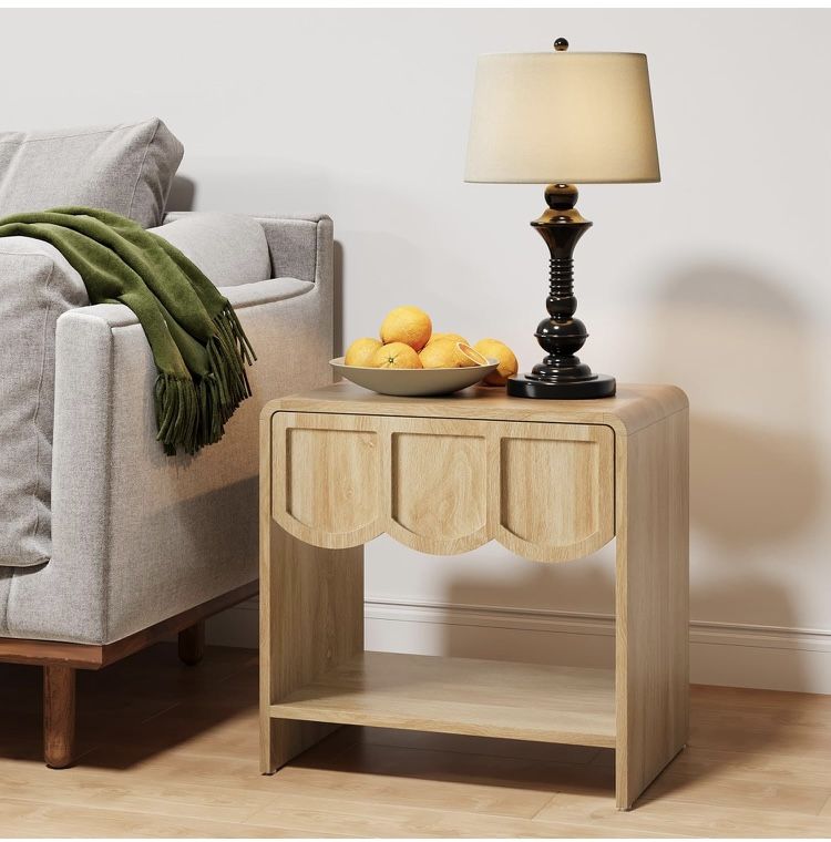 Small Night Stand, Mid Century Modern Farmhouse Wood Nightstand with Wave Panel Drawer, Bed Side End Table for Small Space, Living Room - Natural