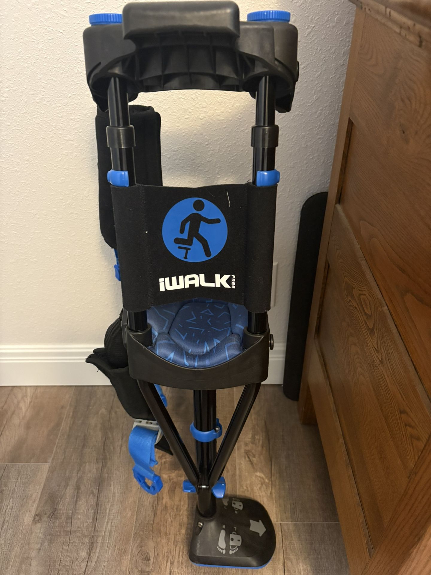 I-walk knee crutch. Barely used. Like new. Velcro straps Adjustable for either leg. Dial settings for individual needs. Very easy to adapt to get around.