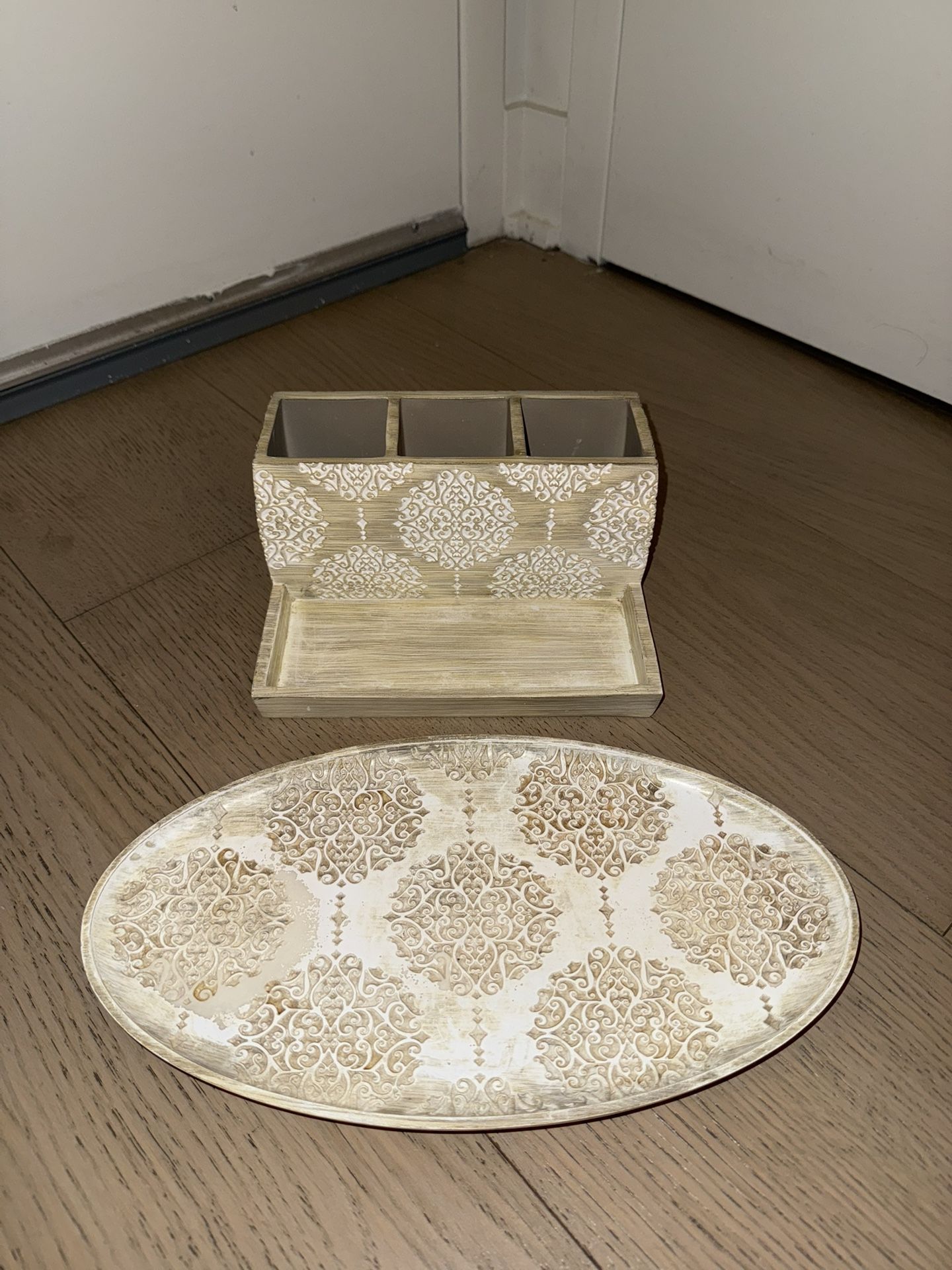 Selling a bathroom vanity set that includes a tray and organizer. The set has a neutral color palette with a decorative pattern. It's perfect for keeping your bathroom essentials neat and tidy! Cash and pick up only in Jersey City.