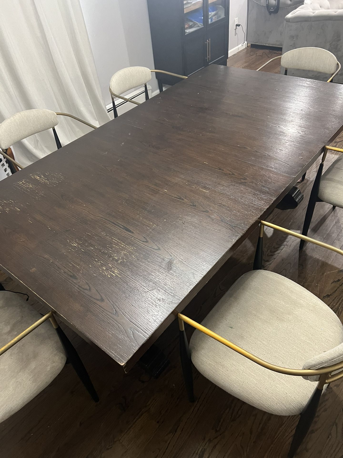 MUST GO! BEST OFFER TAKES IT!! Used Dinning table but still great condition! $200 7ft (84in) long and converts to 9ft(108 in) long Chairs $20 a piece - used and just needs to be cleaned!! Together-$300!! Hit me up ASAP !! PICK UP ONLY!!