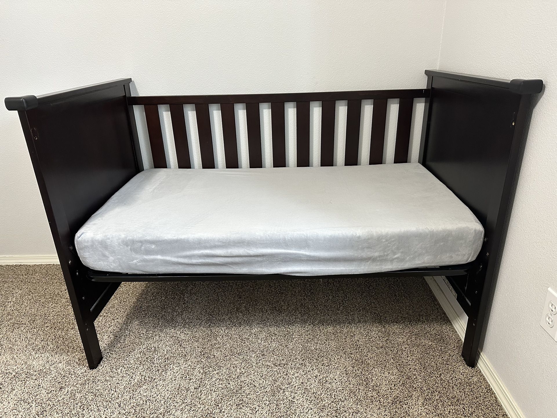 Crib/bed are used, but still in good and working condition. Fourth crib wall included, but not pictured. Crib is disassembled, but easy to rebuild. 54w x 31d x 37t Mattress is dual sided (firm for infants, less firm for toddler use), and unused. Pet free/smoke free home. Porch pickup. Cash or Venmo.
