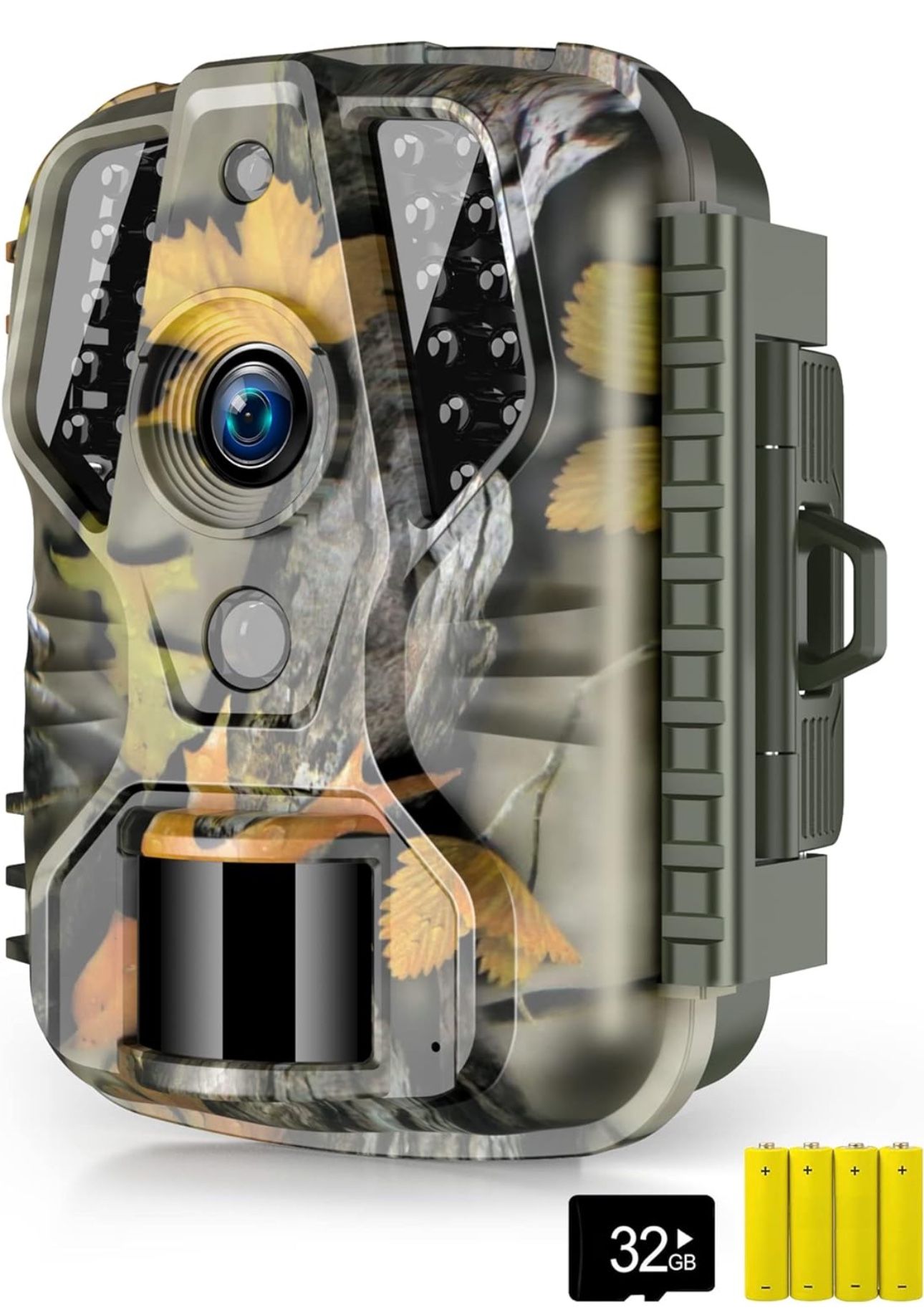 【MORE STEALTHY MINI TRAIL CAMERA】 Vikeri new upgraded mini trail camera design is more compact and 40% smaller than other trail cameras, making it easy to carry. With camouflage color matching, the trail cam is more concealed, and it is not easy to be found by wildlife such as deer. The optimized structure makes this stealth cam more convenient to operate, has lower power consumption, and can better track animals 【20MP 1080P HD & 0.2S TRIGGER TIME】 Vikeri mini trail camera is smaller in size but still has many functions. The outdoor game camera can take 20MP HD photos and 1080P videos. The motion activated sensor can be triggered within 0.2s and 1-10 photos can be taken continuously. So you won’t miss any wonderful moments of wildlife, and you can better observe or trail wildlife. Package includes a 32GB micro SD card. The hunting camera supports up to 256G memory card 【120° WIDE ANGLE MONITORING & 65FT DETECTION RANGE】 Night vision trail camera has 22 no glow infrared LEDs which provide clear night vision. The trail camera won't disturb the animal's nocturnal activities and won't be seen by the animal. The motion sensor camera is equipped with a 120° wide-angle lens and a motion detector with a detection range of 65 ft which can better monitor every passing animal and record the moment of animal activity at night clearly 【IP66 WATERPROOF & MORE FUNCTIONS】 This wildlife camera has a built-in rubber seal. Its waterproof rating is IP66, which is suitable for outdoor observation of wildlife. This trail camera has three camera modes (photo, video, both photo & video), sends pictures to cell phone or computer via data cable, records audio, time lapse, target record time, endless capture, set passwords, set multiple languages, etc 【SUITABLE FOR OUTDOOR ACTIVITIES】The Outdoor hidden camera comes with a threaded tripod and mounting straps, which can adapt to different environments and carry out various outdoor activities. For example, hunting, tracking or observing wildlife, monitoring farm safety, maintaining home safety, etc
