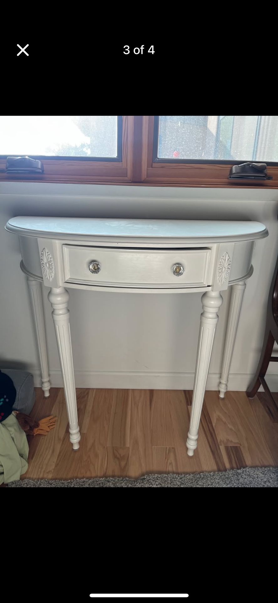 Elegant white half moon console table with carved detailing. Could do with a fresh coat of paint on the top.