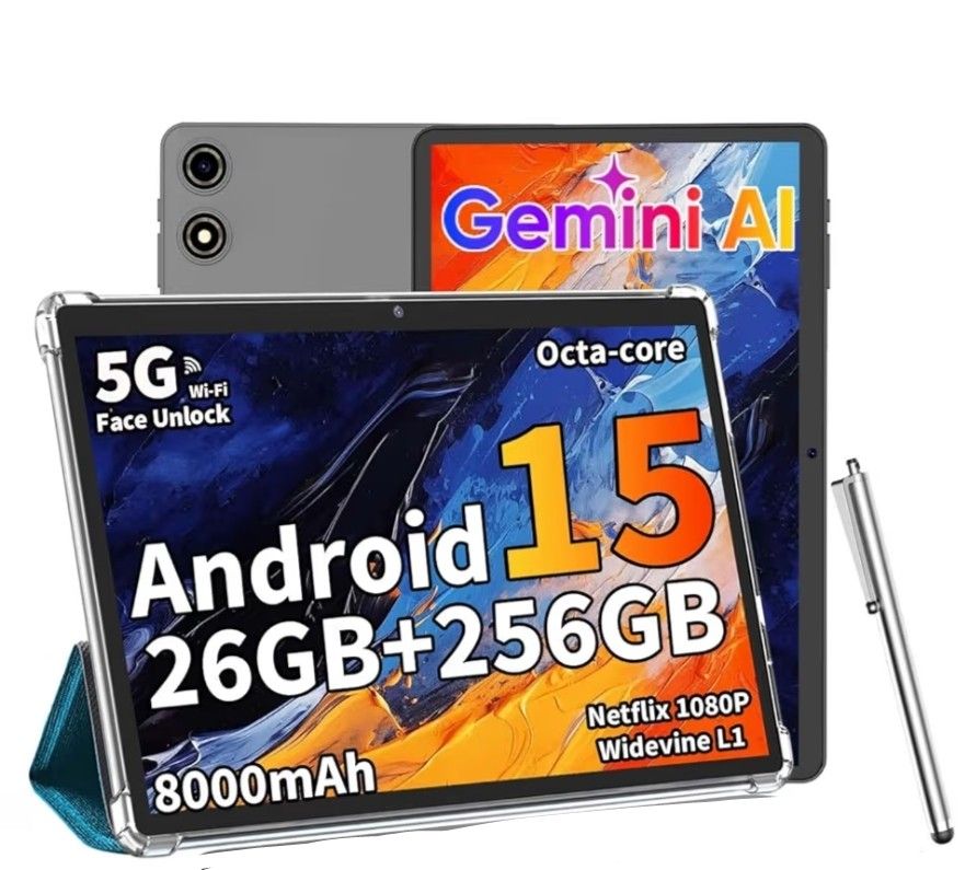 Android 15 Tablet with Case, Pen and Charger, 26GB RAM+256GB ROM(2TB Expand), 10 inch tablet with 8000mAh Battery, 2.4G/5G WiFi, Dual Camera