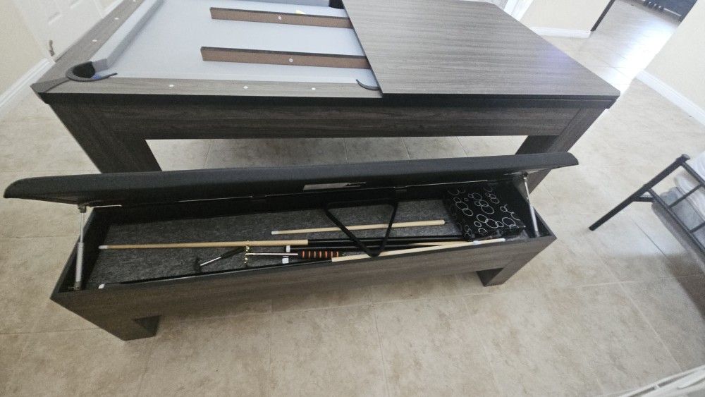 Pool table that serves as a dining table, and converts for table tennis. Comes will all things needed for both pool and table tennis. Comes with 2 benches. Table is approximately 84×47x32 inches. Benches are approximately 68x13x19. Table is minimally used. It is extremely heavy (at least 250 lbs) and I cannot figure out how to take it apart, so unless you can get it apart, it will need to be transported as is. I can help move it, but it probably takes 4-6 average people to lift it into a truck.