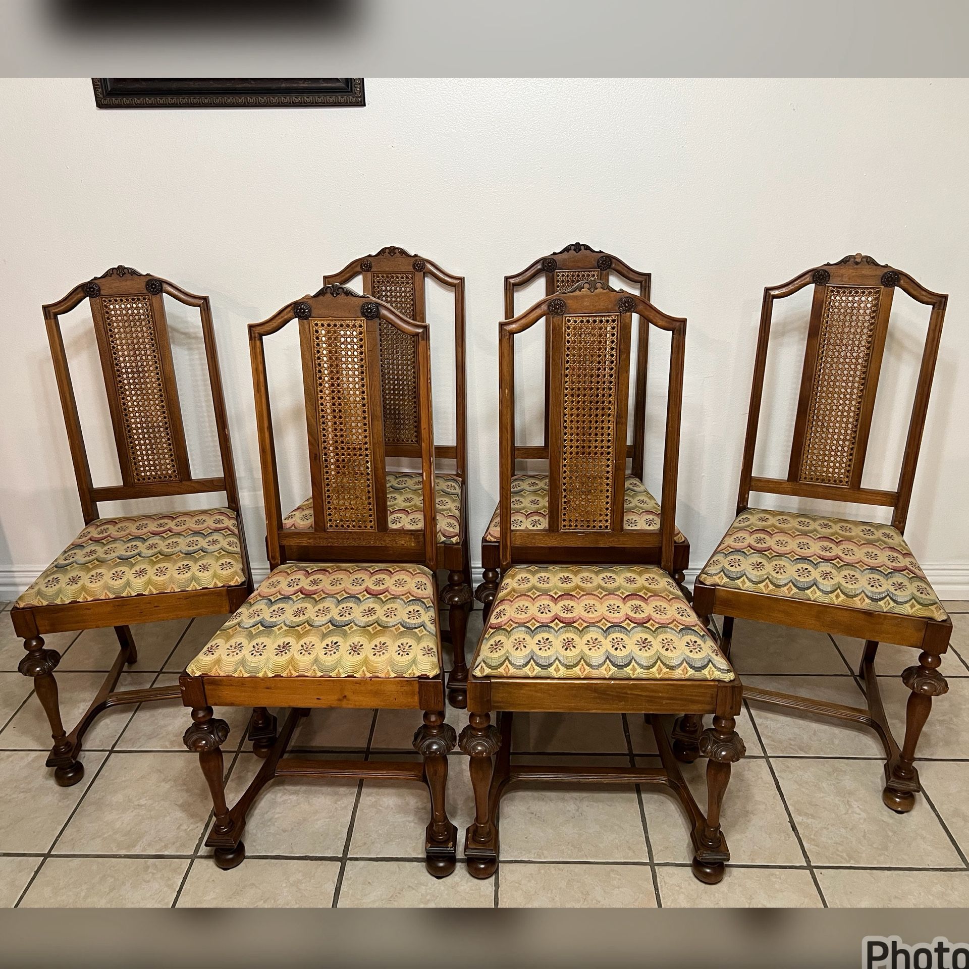 THIS IS A LISTING FOR A SET OF 6 BEAUTIFUL VINTAGE CHAIRS THERE ARE IN GOOD CONDITION FOR THE AGE THAT THEY ARE IN , A FEW FLAWS IN THE PICTURES SHOWN ABOVE BUT OTHER THAN THAT, GOOD CONDITION MEASUREMENTS : HEIGHT : 41.5” LENGTH : 20” WIDTH : 18” SEAT HEIGHT : 19.5” OPEN TO OFFERS, THANK YOU