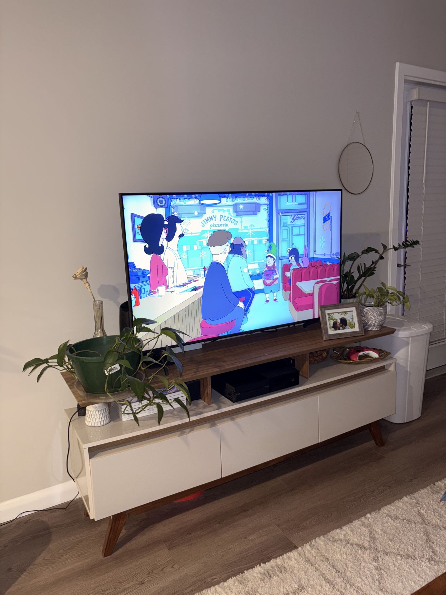 Originally from Wayfair, bought 4 years ago. Minimal wear and tear. There’s room for more than one game console, all the games and accessories can be stored underneath. The color is off white and the wood is a light tan wash