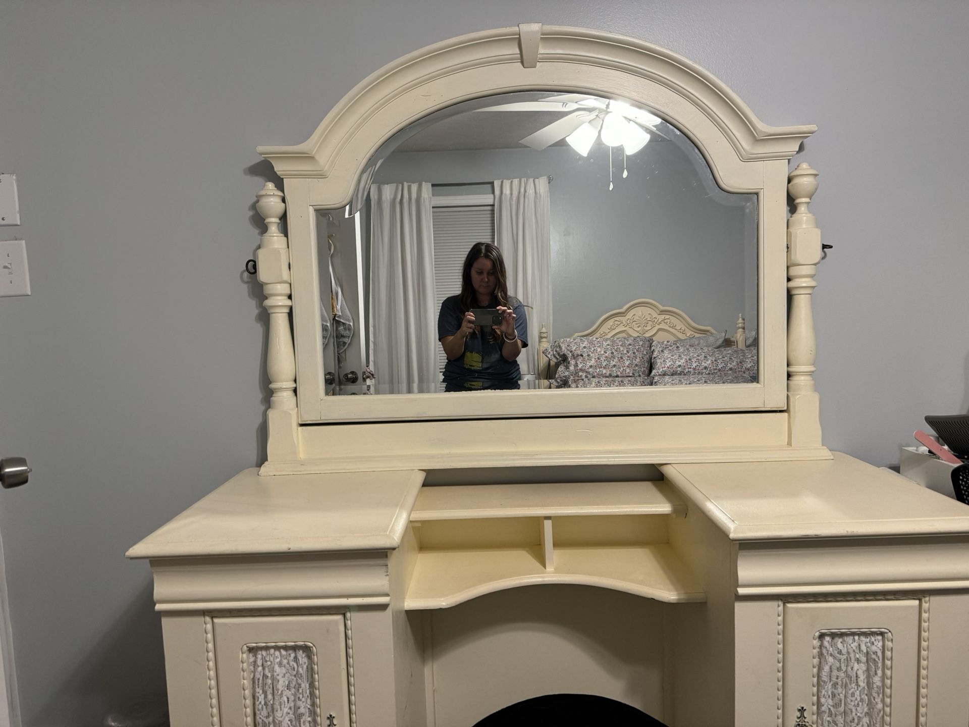 Beautiful solid wood vanity with large mirror. Both doors have curtains that can be changed out if it’s not your style. Great storage. One leg needs to be tightened up but can be fixed. Black cushioned stool available for free with it if you’re interested. It has been well loved and has a couple of moving scuffs but in great shape otherwise. This is very heavy and is a solid piece, other than the feet which will screw off. You will need a trailer or a truck with adequate room. Pickup only. It is 54” wide 21” from the wall 32” tall (top of vanity not mirror)