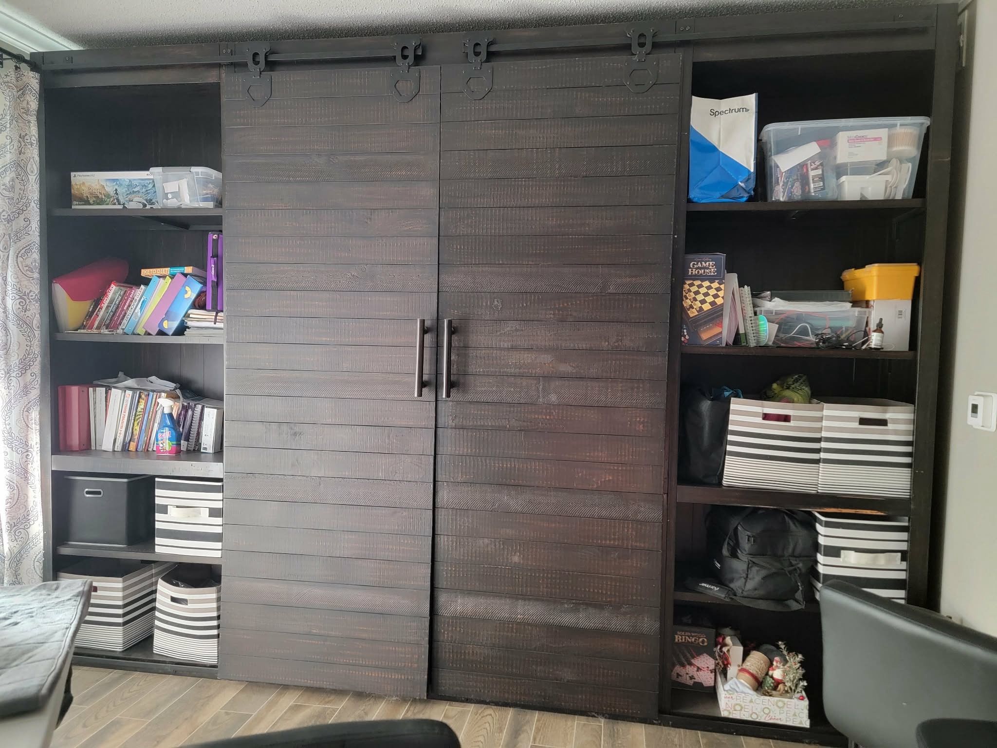 Dark gray solid wood 10’ tall entertainment center . Slight wear and tear. Barn door bookshelves.