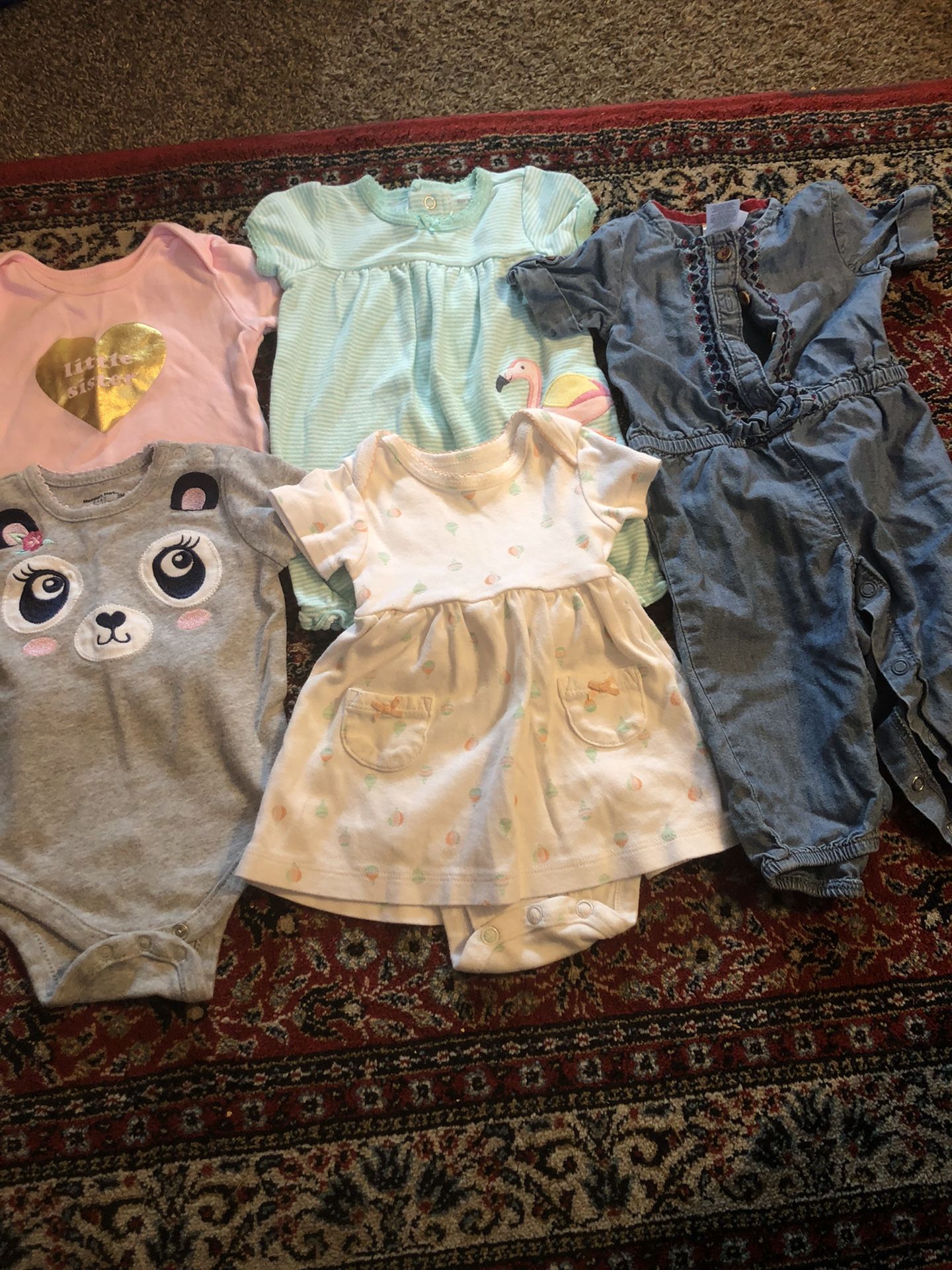 Special selection of brand named 3 months girls wear: 2 onesies 1 romper dress 1 romper 1 romper pants