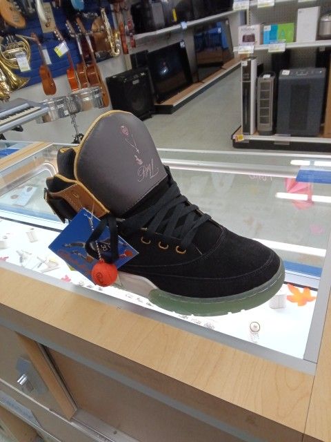 The central focus of the image, these are a special edition high-top basketball sneaker created in collaboration with the family of legendary rapper Big L. They feature a premium black suede upper, gold detailing, and a classic reversible ankle strap. Make Me A Offer! ASK FOR NANCY