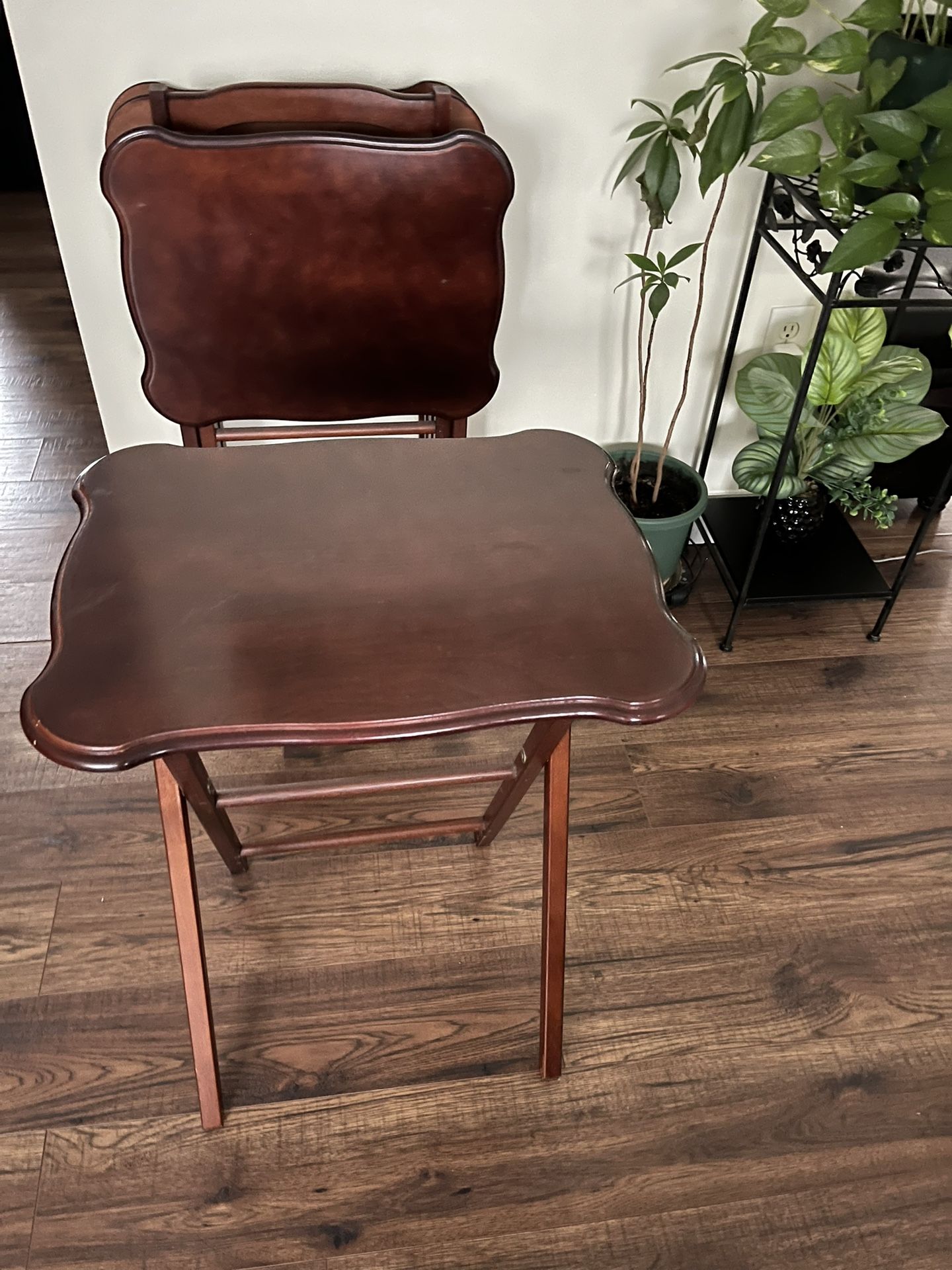 5-piece TV folding tables/trays set for sale. It includes four wooden folding tables and a rack for easy storage. This set can be used in different ways around the house. Price is $30. We are located in Waxhaw not far from the Waxhaw elementary school. Please contact us if you’re interested. Thank you.