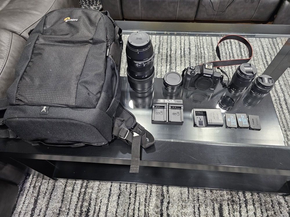 Cannon EOS M50 Sigma 100-400 mm lens + cannon adapter Cannon 55-200 mm lens Cannon 14-45 mm lens 3 batteries + 2 chargers Lowepro backpack