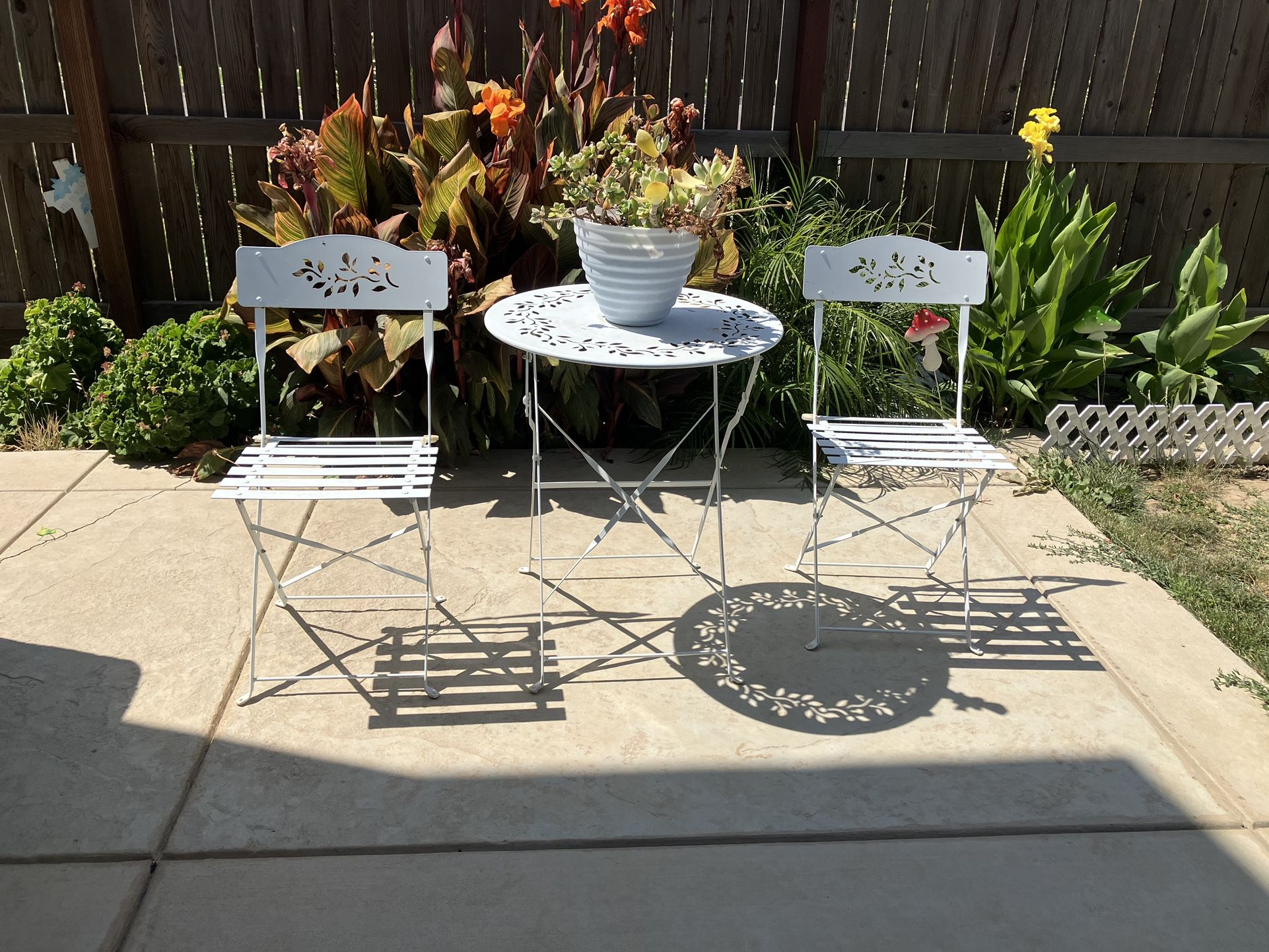Nice white bistro set. There are some rust in some areas due to being outside, but still looks pretty good.