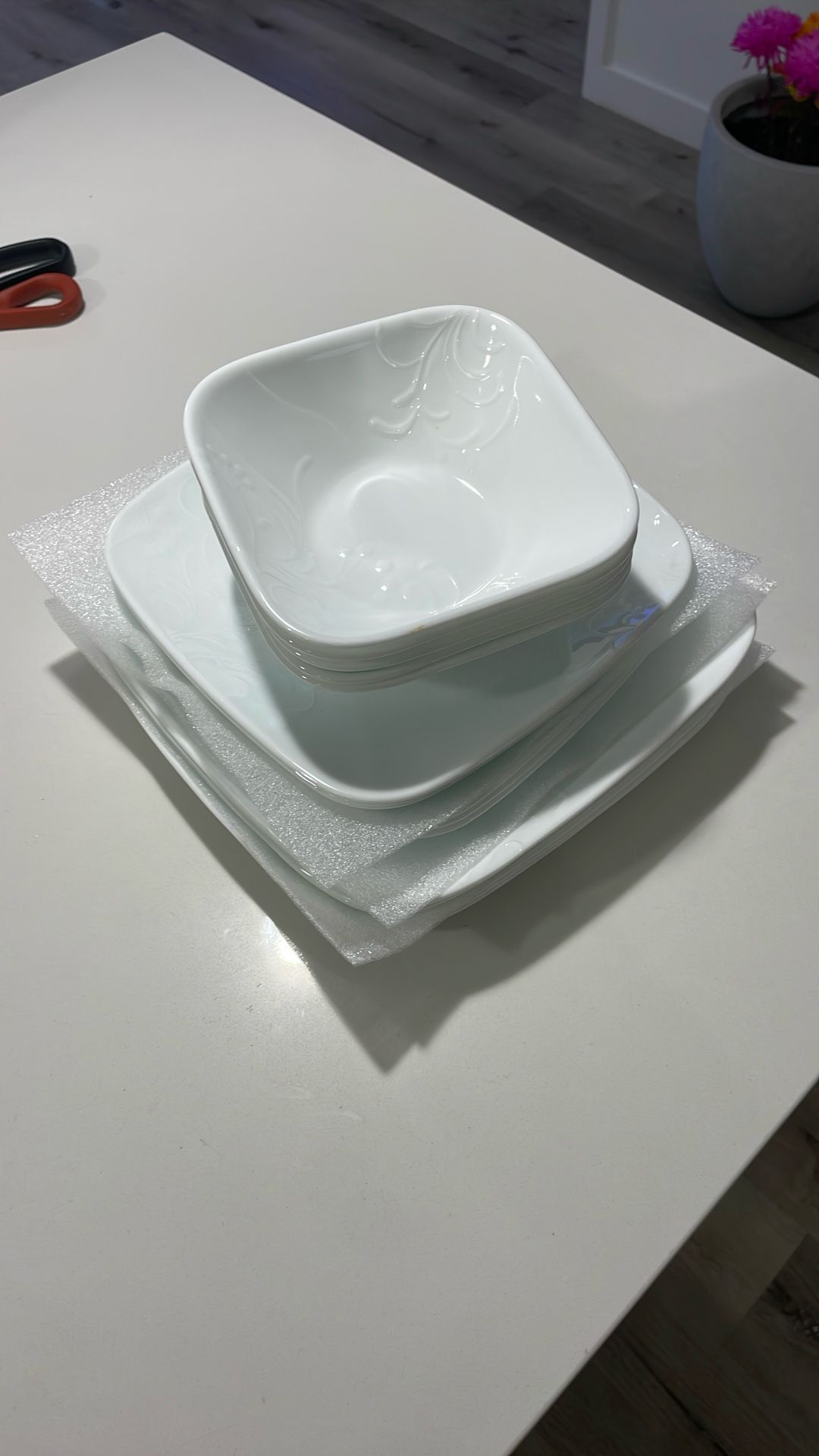 Corelle square plate set 6 large dinner dishes 6 medium appetizer dishes 6 small soup bowls Great shape Make me a reasonable offer