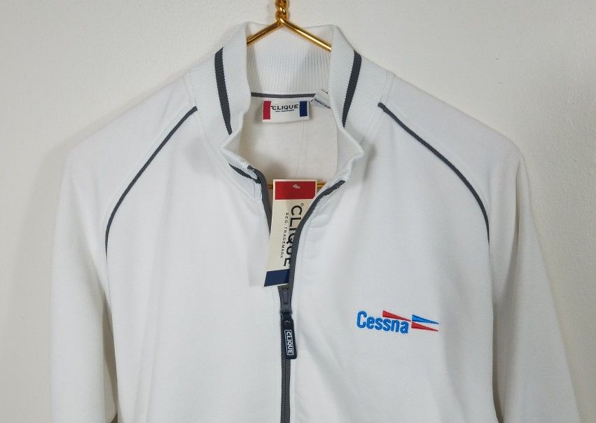 zip up windbreaker/ light jacket with embroidered Cessna logo. New with tag. Made by Clique. Mens size large(looser, relaxed fit large). White with grey trim and piping, red/blue Cessna logo. Zippered pockets
