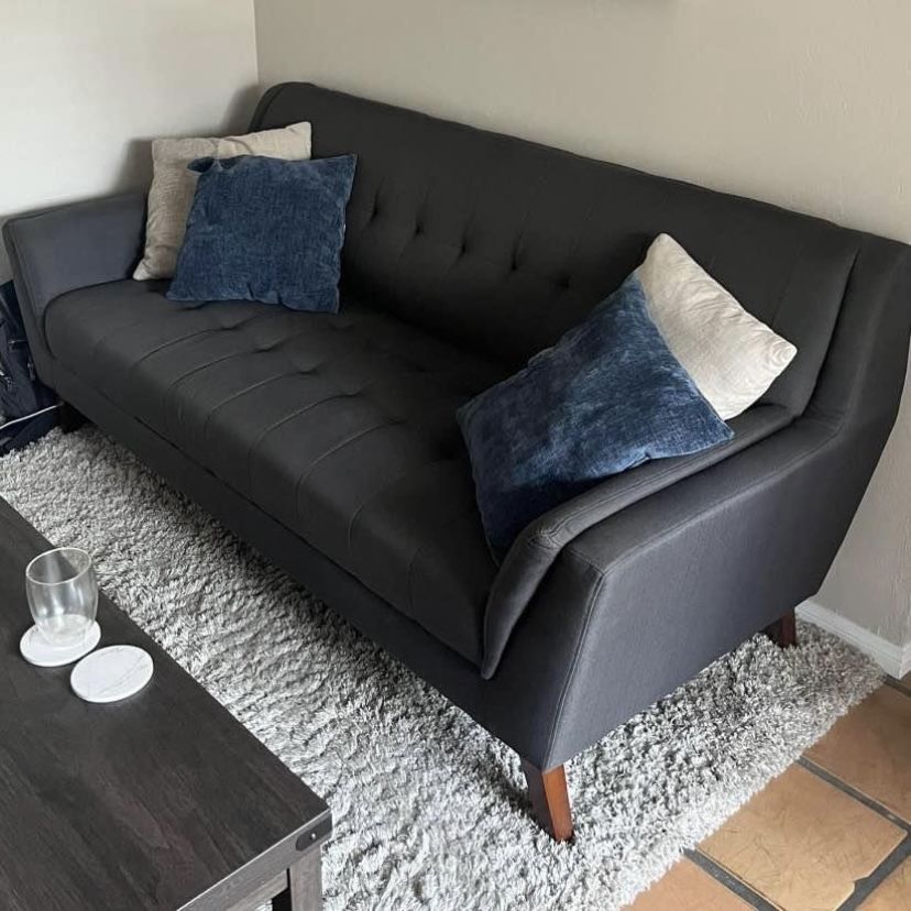 Selling my dark gray mid-century modern sofa, made by Jerome's Furniture. It's got a cushioned backrest, slim build, comfy padded seating, and really smooth fabric. It's in excellent shape, with no wear/tear. Stain free, no rips, and pet free. Upholstery cleaned and sanitized, vacuumed too. Looking to sell today. Pickup in 92109 or delivery with zipcode. Dimensions: 79" Across, 34" Tall, 36" Deep, 18" Seat.