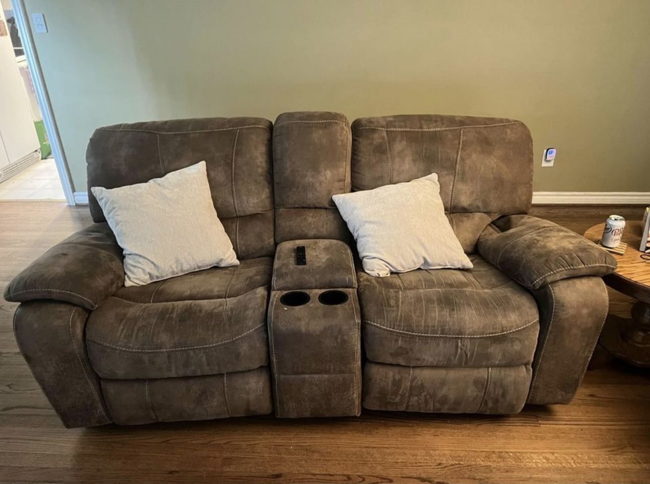 Nice suede brownish tan living room set all recliners work except one you have to pull it open manually. The love seat has a storage compartment and cup holders. Great set for starters or garage/basement man cave for watching/playing the game and entertaining company. Set is not perfect has many flaws as shown in pictures and will need a light cleaning. Backs come off for easy transport. FREE DELIVERY TODAY!