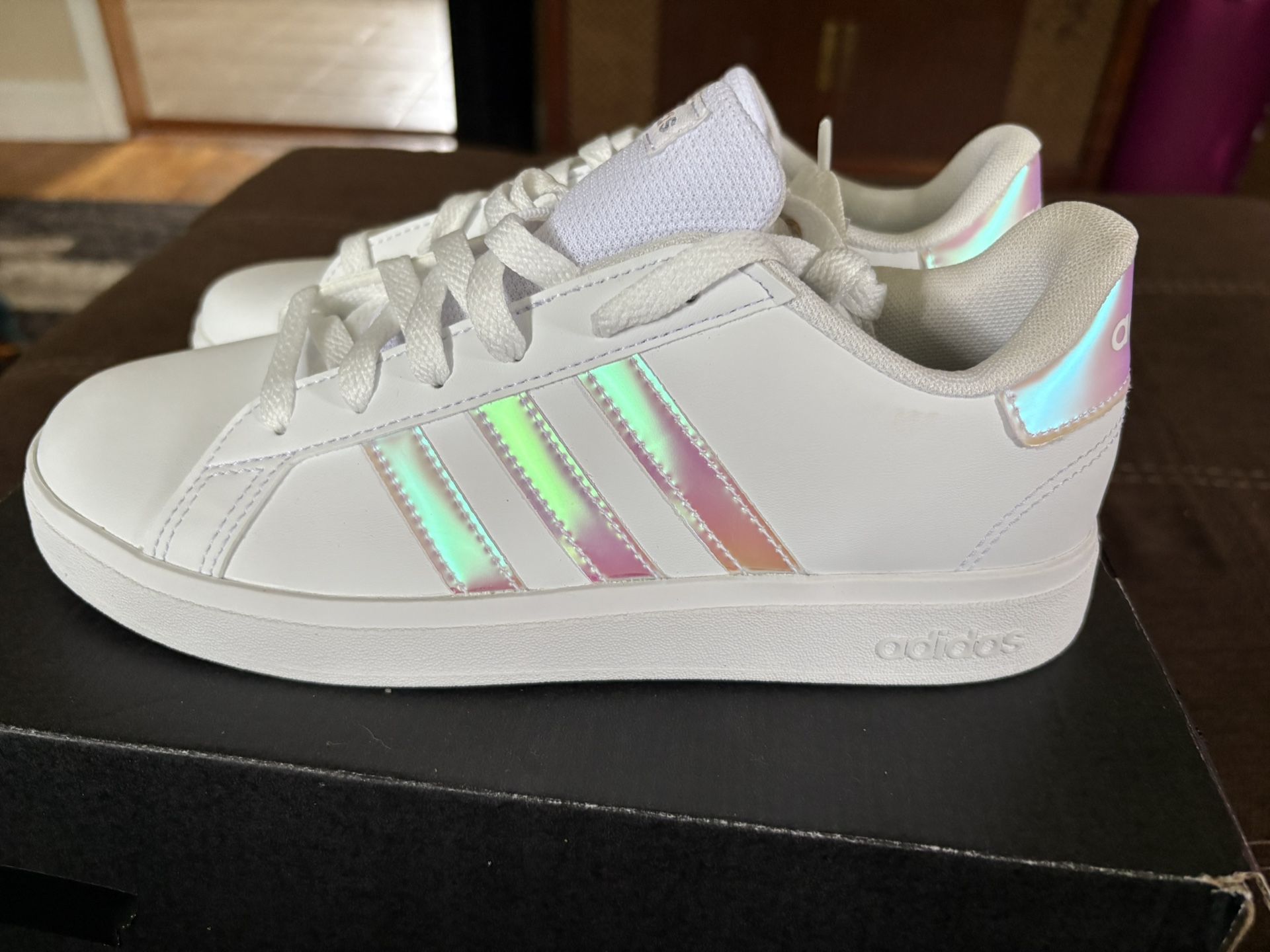 Brand new in box Adidas GrandCourt 2.0 K size 4Y/5W. White with iridescent stripes. $35 OBO Smoke free home