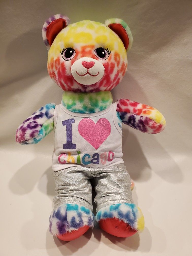 Build A Bear Lisa Frank Inspired rainbow cheetah print Plush. No holes, weird smells, or damage to the item. Has a I ♡Chicago tank and silver pants. 17" Comes from a smoke and pet free home