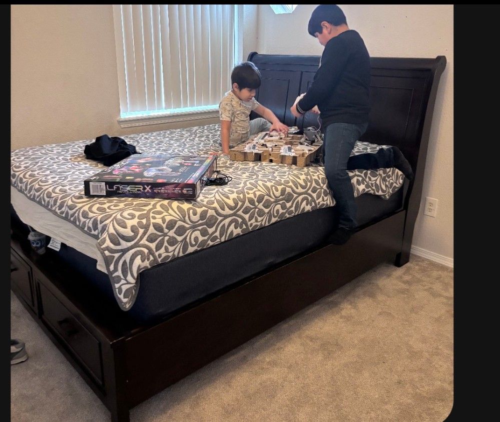 Queen size wooden bedframe, with two drawers on the footboard, espresso color.