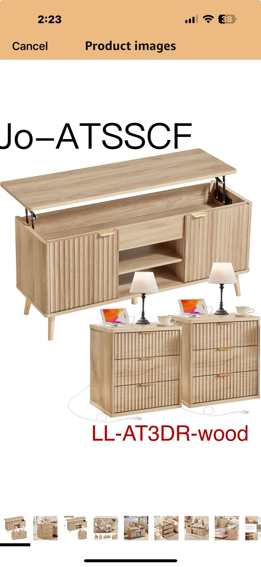 New in box LEYAOYAO Fluted Lift Top Coffee Table and Nightstand Set of 3,Wood 48" Wide Center Tables & 23" Night Stand with 3 Drawers,Living Room Suites for Bedroom Home Living Room,Natural Wood, JO-ATsscf, LL-AT3DR-wood