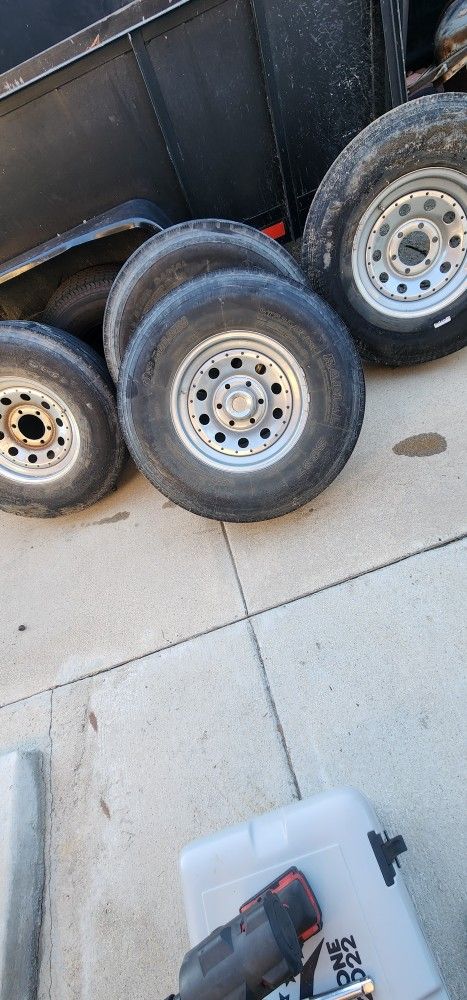 235 85 16 tires have air but there no good only have 2 caps missing the other 2 ... I put smaller rims on my trailer with new tires dont need this ones anymore .... asking $100 ... located in perris ca...