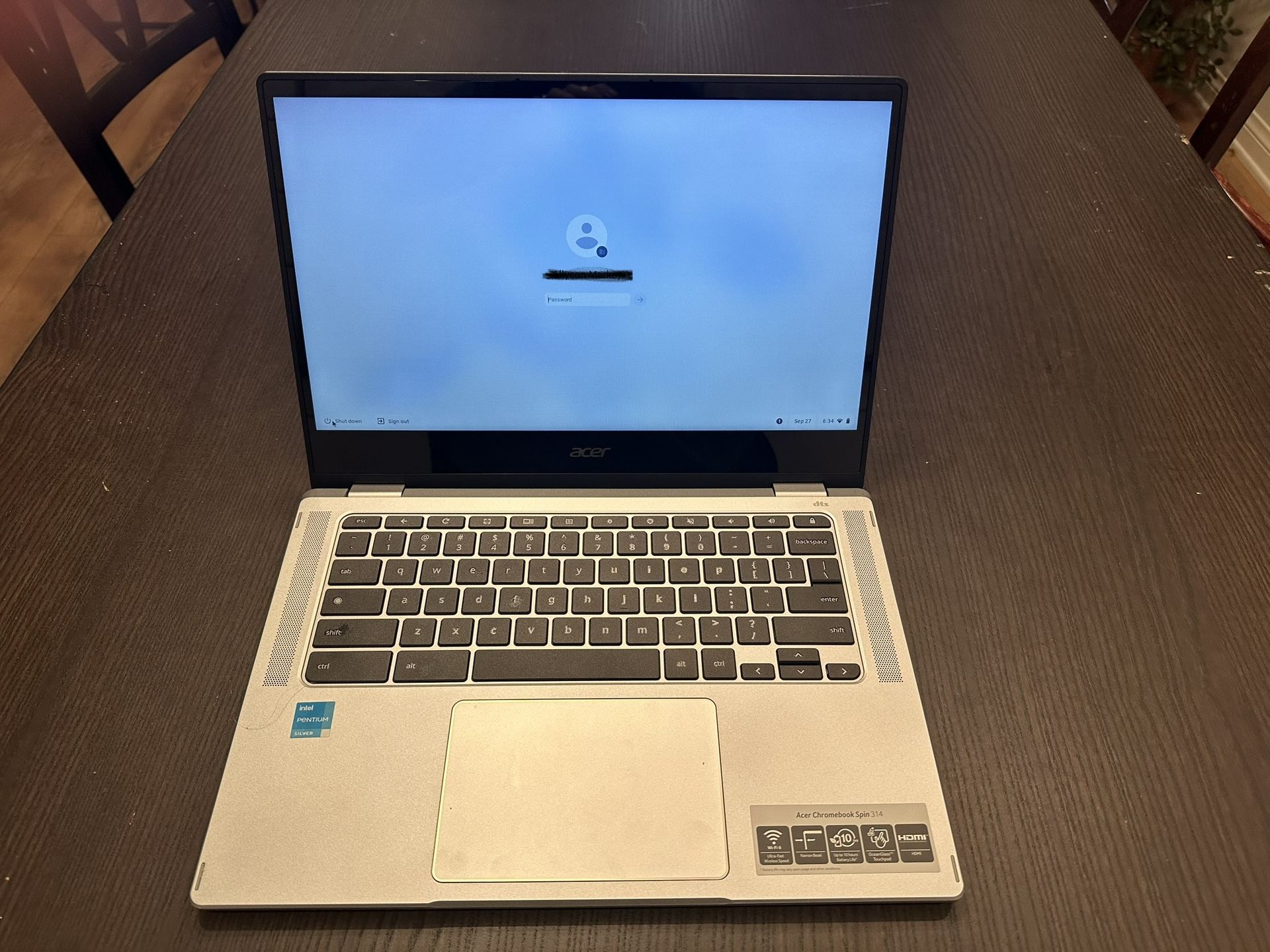Barely used Acer Chromebook Spin 314 Convertible Laptop. Have all the power cords, no scratches on outer casings. Screen works perfectly ! Internal: Intel Pentium Silver N6000 | 14" HD Corning Gorilla Glass Touch Display | 4GB LPDDR4X | 128GB eMMC | Intel Wi-Fi 6 AX201 | Chrome OS | CP314-1H-P9G7
